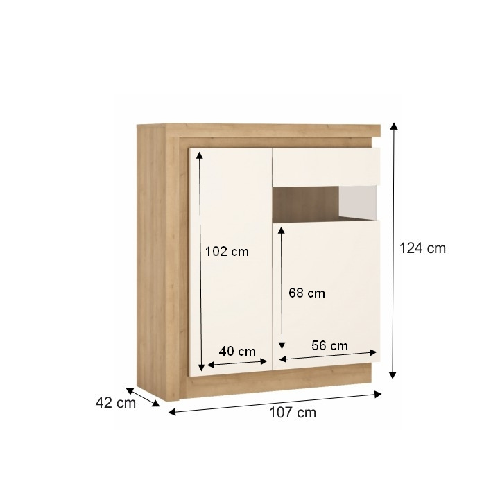 Komoda LYOV04P ze sektorové sestavy LEONARDO v provedení dub riviera / bílá s vysokým leskem. Rozměry (ŠxHxV): 107x42x124 cm Tloušťka materálu: 16 mm Systém tichého dorazu dvířek Dodávané v demontu