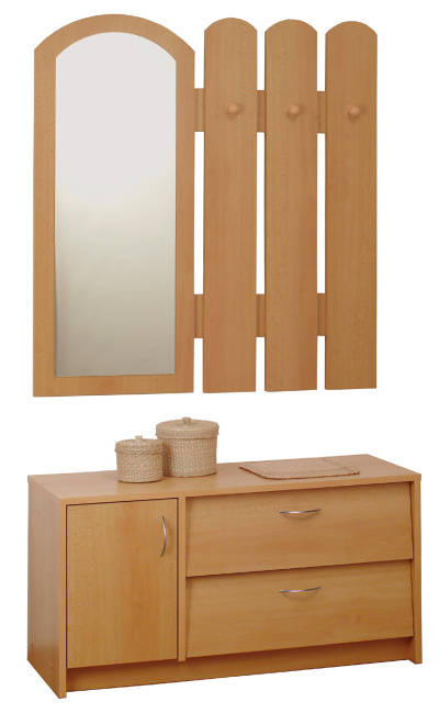 Dobře organizovaný vstupní prostor bytu se neobejde bez funkční předsíňové stěny. Předsíňová stěna do vstupní haly nabízí dostatek háčků na odložení šatstva a velký úložný prostor tvořený botníkem. Zrcadlo umožňuje před odchodem z domova překontrolovat úpravu zevnějšku.