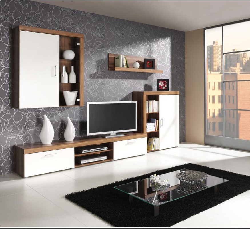 V ceně sestavy je TV stolek, závěsná vitrína, police a skříňka.