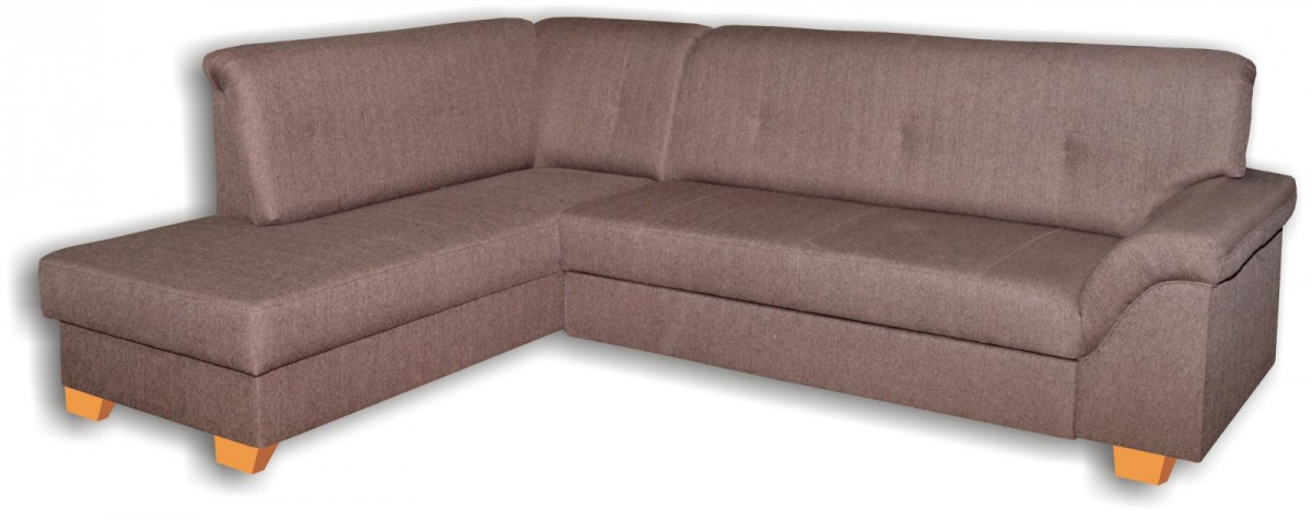 Moderní rohová rozkládací sedací souprava 250x180 cm s velkým úložným prostorem. Nožky jsou dřevěné v odstínu olše. Sedací souprava je vybavená rozkladem s vynášecím systémem postele.