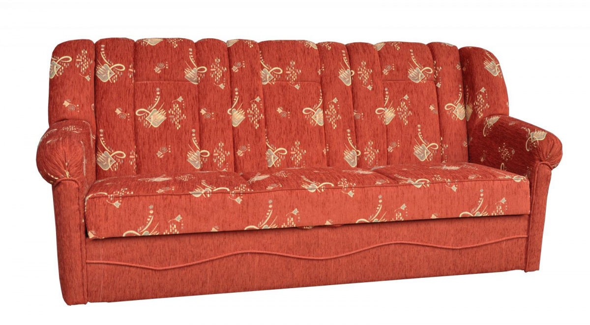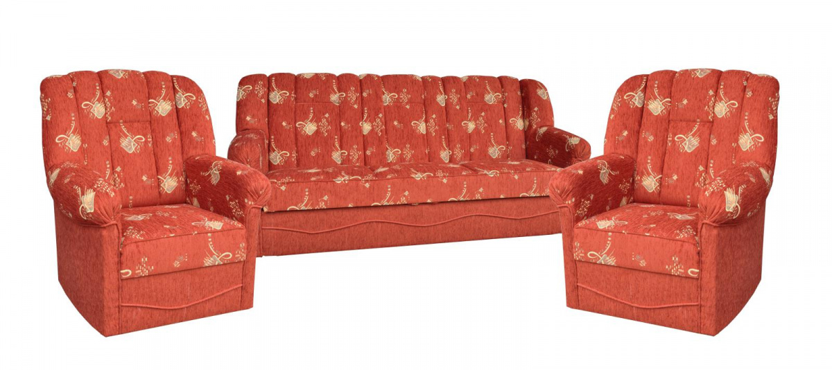 Klasická rozkládací sedací souprava vhodná také do menších bytů. Sedací souprava má praktický úložný prostor a jednoduchým rozkladem vznikne lůžko vhodné k příležitostnému spaní. Sedací souprava má pružinové jádro. Sedací souprava se skládá z rozkládacího trojsedu a dvou křesel. Tato sedačka je očalouněná kvalitní potahovou látkou. Tato látka je snadno čistitelná suchou pěnou.