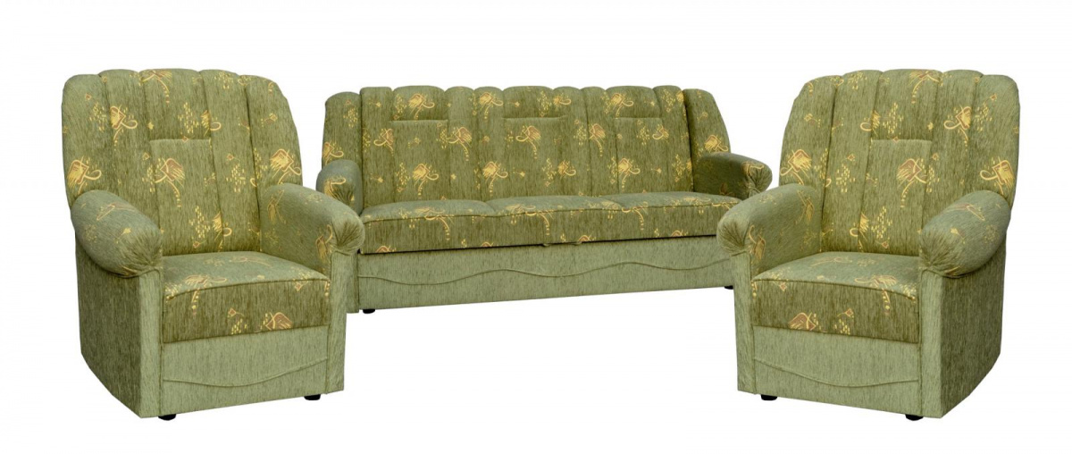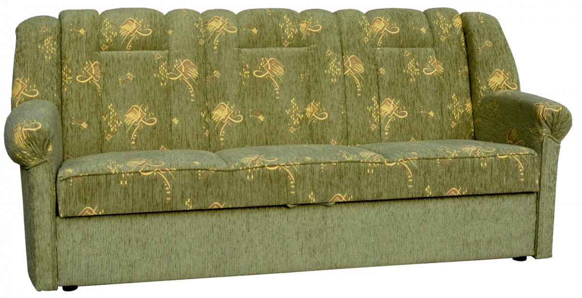 Klasická rozkládací sedací souprava vhodná také do menších bytů. Sedací souprava má praktický úložný prostor a jednoduchým rozkladem vznikne lůžko vhodné k příležitostnému spaní. Sedací souprava má pružinové jádro. Sedací souprava se skládá z rozkládacího trojsedu a dvou křesel. Tato sedačka je očalouněná kvalitní potahovou látkou. Tato látka je snadno čistitelná suchou pěnou.