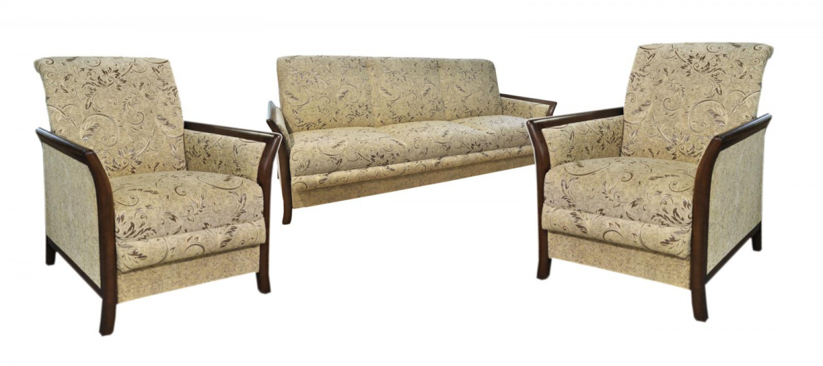 Elegantní sedací souprava Jana s rozkládacím trojsedem a dvěma křesly. Sedací souprava má úložný prostor a jednoduchým rozkladem vznikne lůžko na občasné přespání pro dvě osoby. Výplň sedáku tvoří kombinace pružin bonell a faliste s kvalitní PUR pěnou. Sedací souprava je očalouněná kvalitní látkou Vita. Čalounění v kombinaci se dřevem působí velice stylově. Bočnice jsou vyrobené z bukového masivu, moření je možné v různých barevních odstínech. Sedací soupravu lze objednat i v jiných barevných provedeních (viz. vzorník látek níže). Odstíny nebo kresba dřeva nemusí přesně odpovídat vyobrazeným vzorkům.