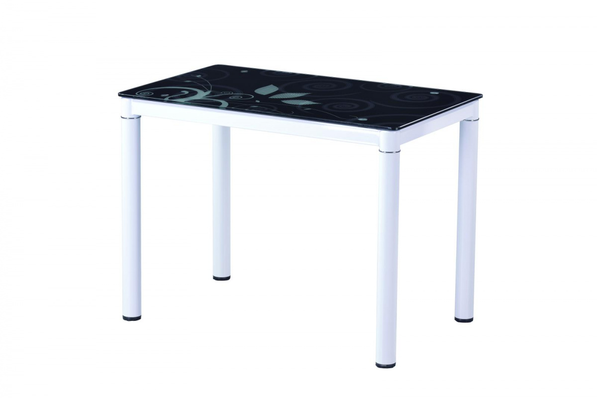 Moderní jídelní stůl v elegantním a praktickém provedení. Nohy stolu jsou vyrobeny z kovu, lakované bílou barvou. Deska stolu je z tvrzeného skla v černé barvě. Na desce stolu jsou jemné, velmi elegantní moderní kresby. K tomuto stolu doporučujeme židle z naší nabídky.