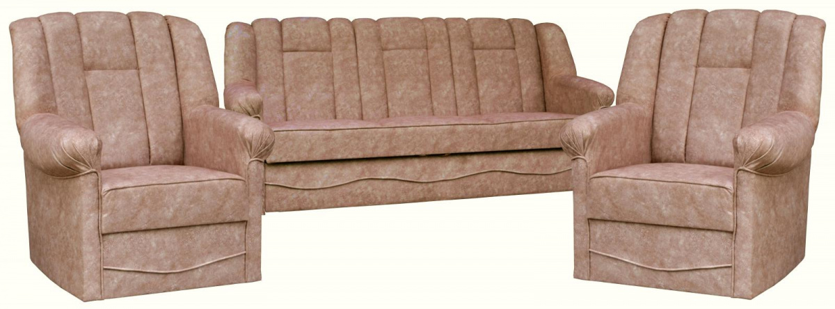 Klasická rozkládací sedací souprava vhodná také do menších bytů. Sedací souprava má praktický úložný prostor a jednoduchým rozkladem vznikne lůžko vhodné k příležitostnému spaní. Sedací souprava má pružinové jádro. Sedací souprava se skládá z rozkládacího trojsedu a dvou křesel. Tato sedačka je očalouněná kvalitní potahovou látkou. Tato látka je snadno čistitelná suchou pěnou.