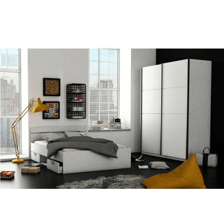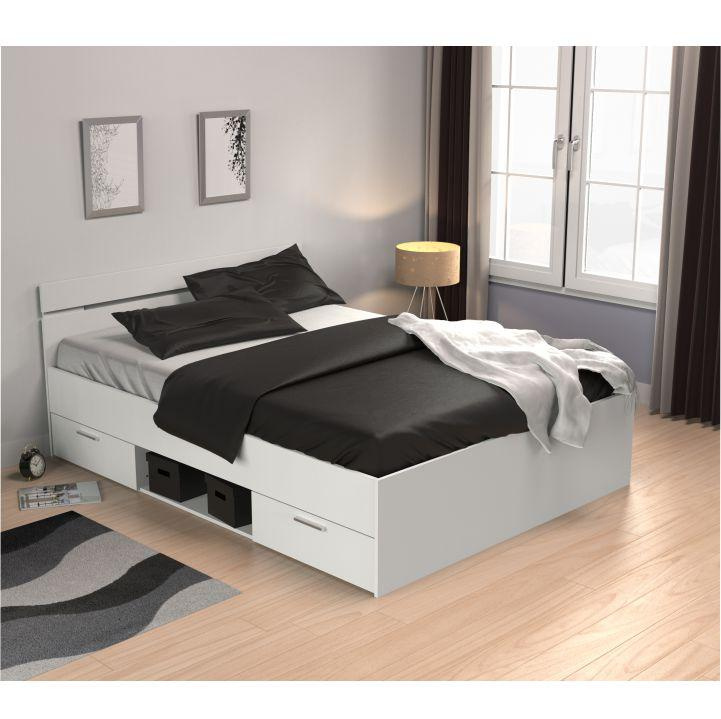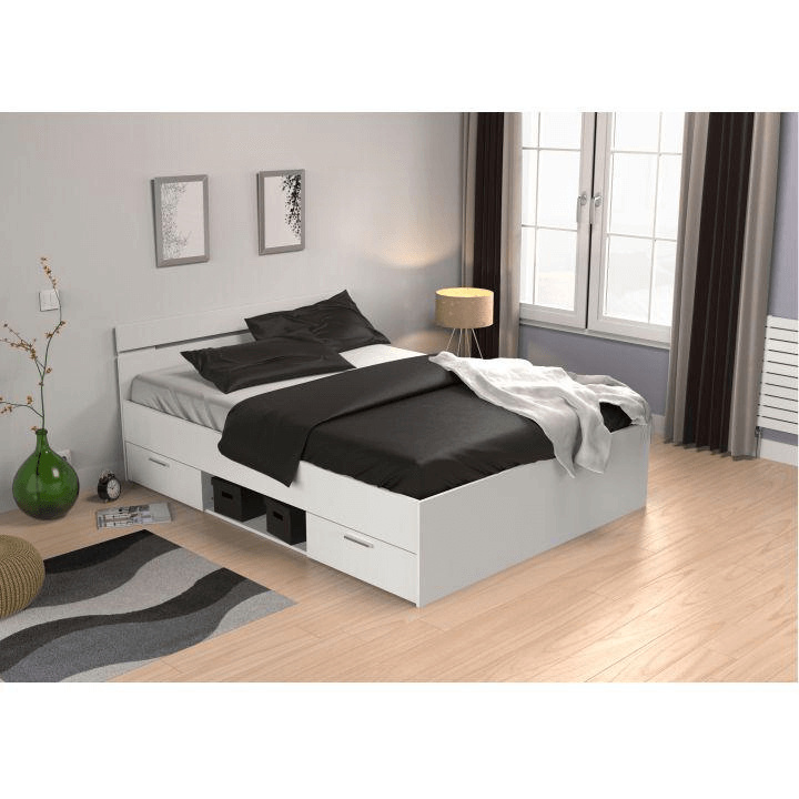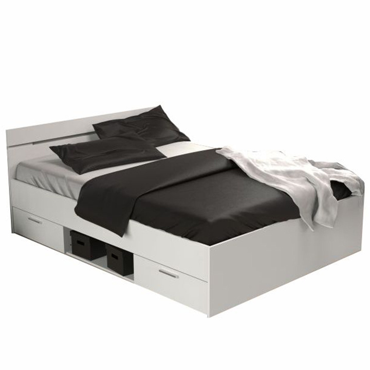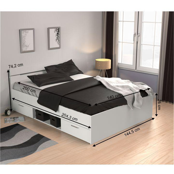Postel MICHIGAN s šuplíky a s odkládacím prostorem. Materiál: DTD foliovaná. Barevné provedení: bílá Rozměry (ŠxHxV): 144,5x204,3x74,2 cm. Plocha na spaní: 140x200 cm. Výška po rošt: 26 cm K posteli je možné zakoupit kovový rošt 7867 140x200 a matraci s rozměrem 140x200 cm na základě naší nabídky.