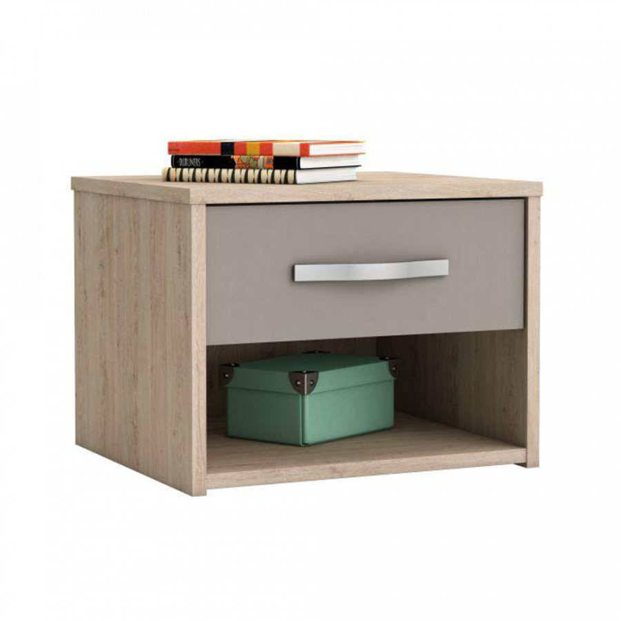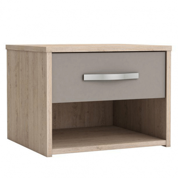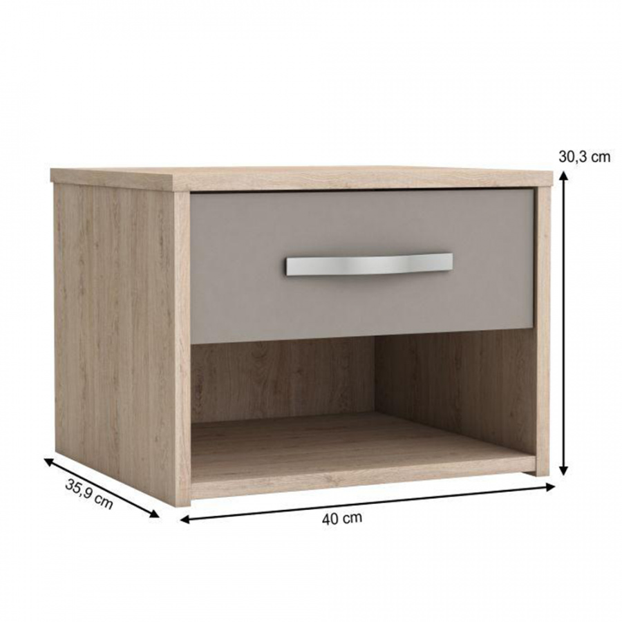 Noční stolek se zásuvkou a s poličkou. Materiál a barevné provedení: DTD foliovaná, dub arizona / šedá. Rozměry (ŠxVxH): 40x30,3x35,9 cm.