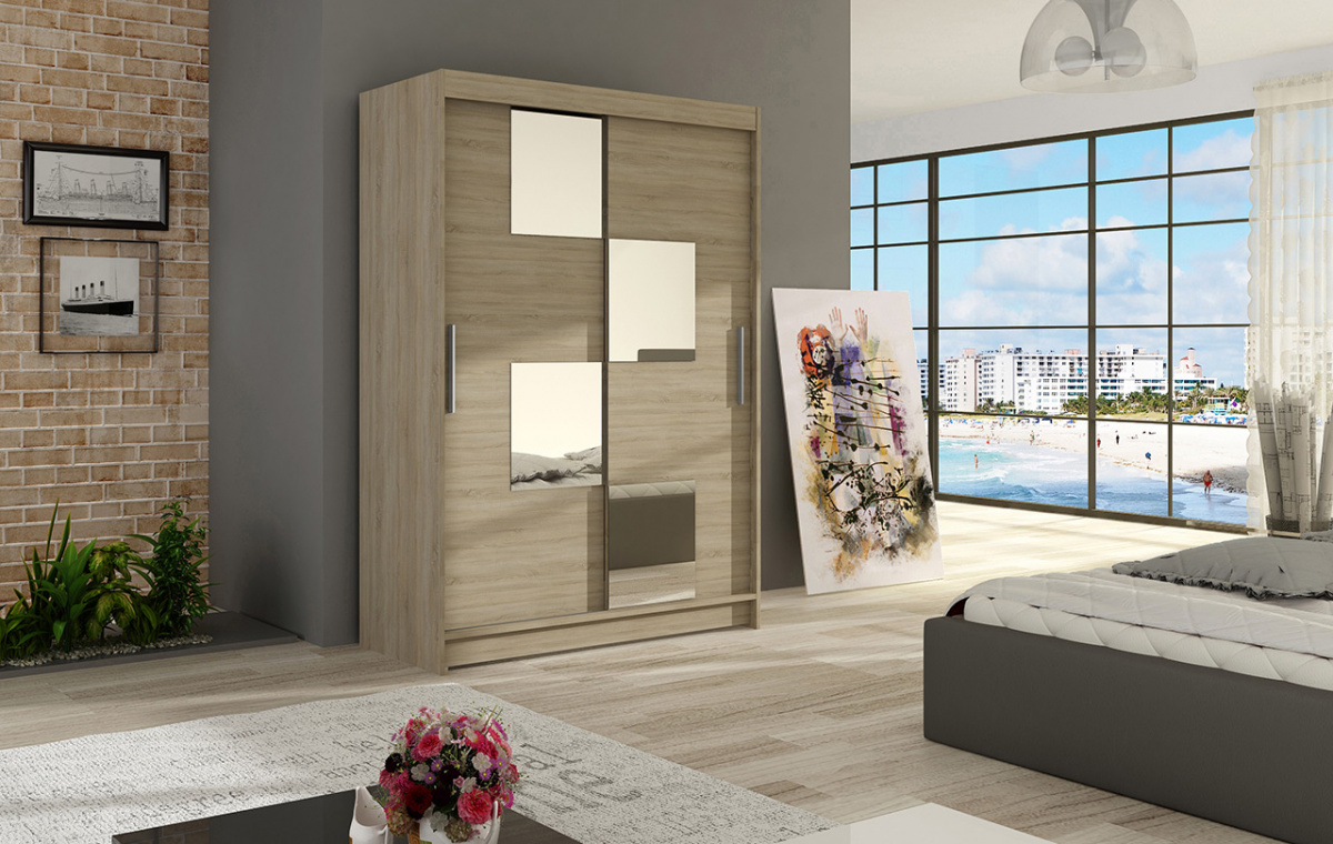 Moderní a elegantní design skříně osloví i náročné zákazníky. Eleganci podtrhují dlouhé stříbrné úchyty a moderní nádech dodávají zrcadla, která jsou nalepena na dveřích skříně. Je vyrobena z lamina o síle 16 mm a hrany jsou ukončeny ABS lištou. Vodící lišty jsou vyrobeny z odolného hliníku a splňují požadavky pro každodenní užívání. Díky svému uspořádání poskytuje dostatek úložného prostoru. Skvěle se hodí do ložnice, předsíně, dětského, nebo studentského pokoje. Skříň je dodávána v demontu a součástí je montážní plánek včetně všech potřebných spojovacích materiálů. Vyobrazené dekorace nejsou v ceně.