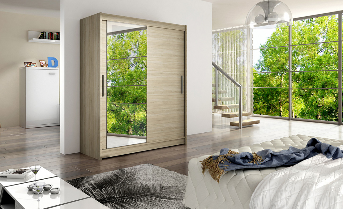 Jednoduchý a elegantní design skříně osloví i náročné zákazníky. Eleganci podtrhují dlouhé stříbrné úchyty a zrcadlo, které je nalepeno na dveřích skříně. Je vyrobena z lamina o síle 16 mm a hrany jsou ukončeny ABS lištou. Vodící lišty jsou vyrobeny z odolného hliníku a splňují požadavky pro každodenní užívání. Díky svému uspořádání poskytuje dostatek úložného prostoru a zrcadlo prostor opticky zvětší a prosvětlí. Skvěle se hodí do ložnice, předsíně, dětského, nebo studentského pokoje. Skříň je dodávána v demontu a součástí je montážní plánek včetně všech potřebných spojovacích materiálů. Vyobrazené dekorace nejsou v ceně.