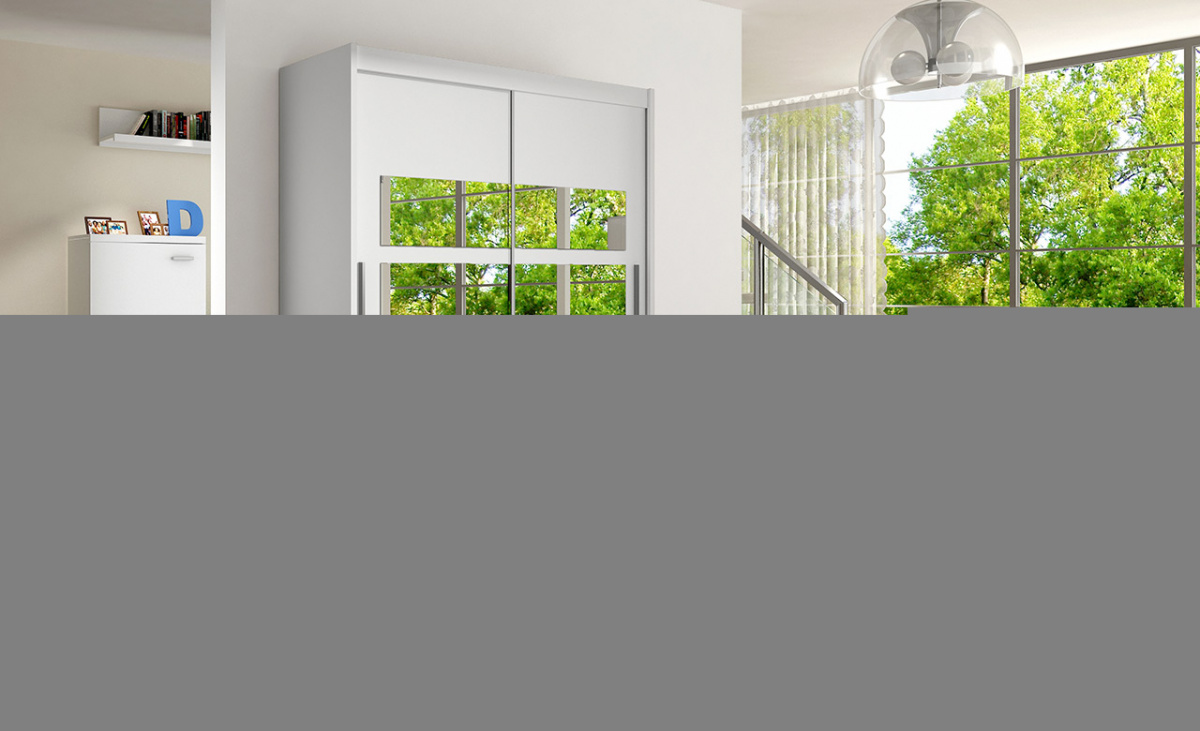 Jednoduchý a elegantní design skříně osloví i náročné zákazníky. Eleganci podtrhují dlouhé stříbrné úchyty a zrcadla, která jsou nalepena na dveřích skříně. Je vyrobena z lamina o síle 16 mm a hrany jsou ukončeny ABS lištou. Vodící lišty jsou vyrobeny z odolného hliníku a splňují požadavky pro každodenní užívání. Díky svému uspořádání poskytuje dostatek úložného prostoru a zrcadlo prostor opticky zvětší a prosvětlí. Skvěle se hodí do ložnice, předsíně, dětského, nebo studentského pokoje. Skříň je dodávána v demontu a součástí je montážní plánek včetně všech potřebných spojovacích materiálů. Vyobrazené dekorace nejsou v ceně.