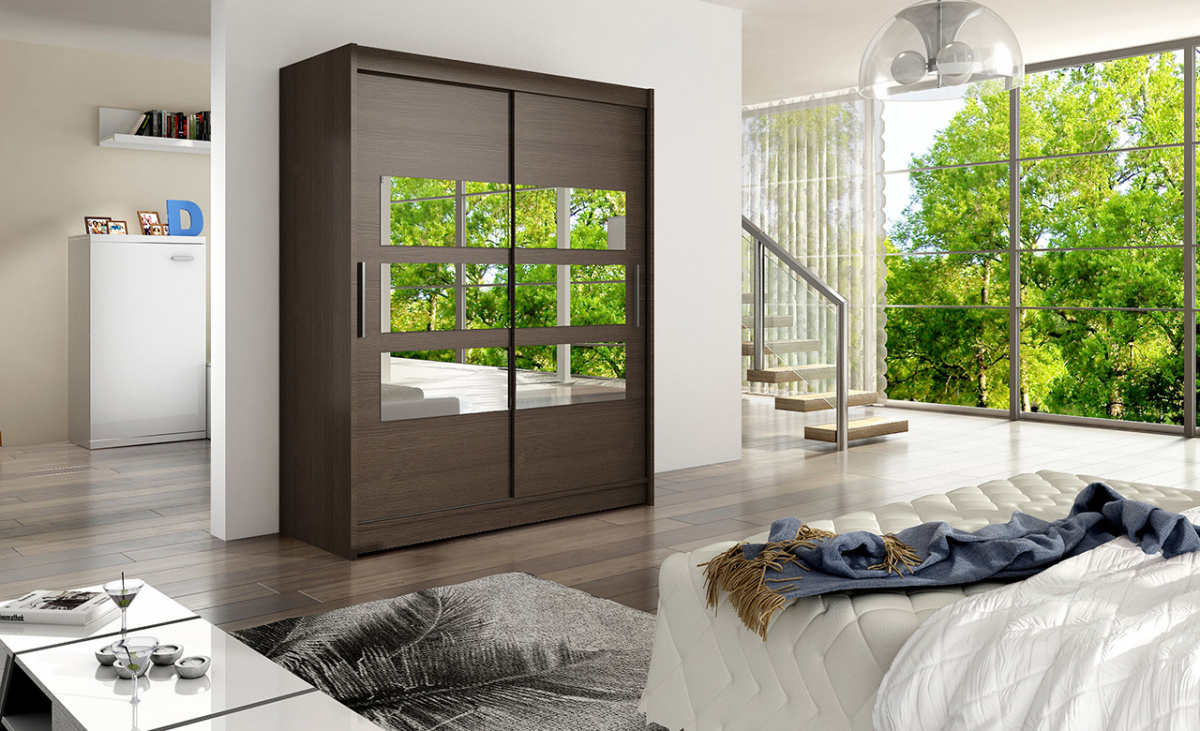 Jednoduchý a elegantní design skříně osloví i náročné zákazníky. Eleganci podtrhují dlouhé stříbrné úchyty a zrcadla, která jsou nalepena na dveřích skříně. Je vyrobena z lamina o síle 16 mm a hrany jsou ukončeny ABS lištou. Vodící lišty jsou vyrobeny z odolného hliníku a splňují požadavky pro každodenní užívání. Díky svému uspořádání poskytuje dostatek úložného prostoru a zrcadlo prostor opticky zvětší a prosvětlí. Skvěle se hodí do ložnice, předsíně, dětského, nebo studentského pokoje. Skříň je dodávána v demontu a součástí je montážní plánek včetně všech potřebných spojovacích materiálů. Vyobrazené dekorace nejsou v ceně.