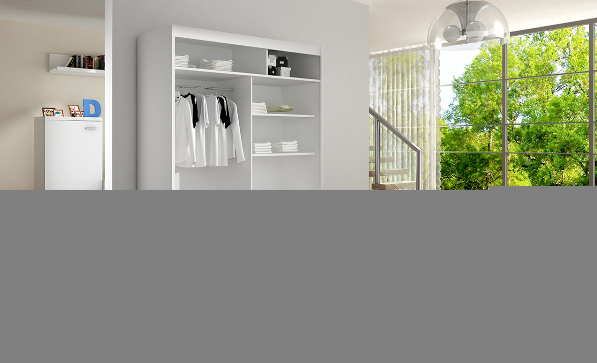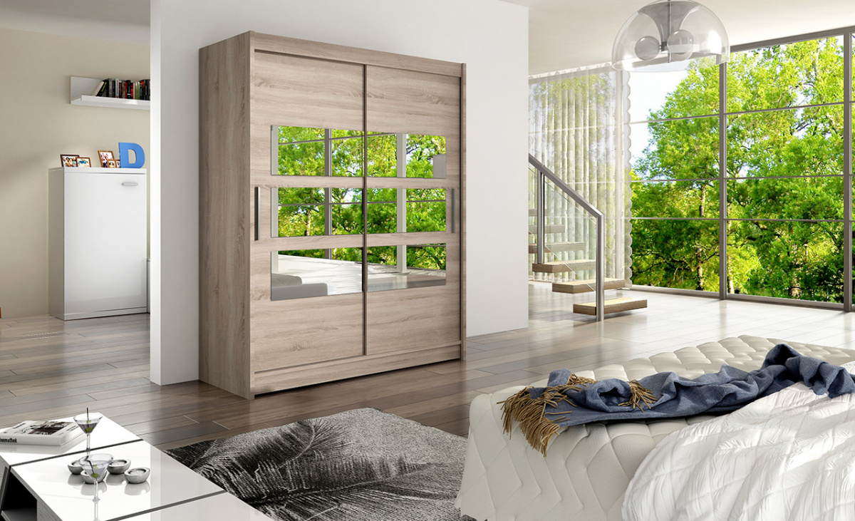 Jednoduchý a elegantní design skříně osloví i náročné zákazníky. Eleganci podtrhují dlouhé stříbrné úchyty a zrcadla, která jsou nalepena na dveřích skříně. Je vyrobena z lamina o síle 16 mm a hrany jsou ukončeny ABS lištou. Vodící lišty jsou vyrobeny z odolného hliníku a splňují požadavky pro každodenní užívání. Díky svému uspořádání poskytuje dostatek úložného prostoru a zrcadlo prostor opticky zvětší a prosvětlí. Skvěle se hodí do ložnice, předsíně, dětského, nebo studentského pokoje. Skříň je dodávána v demontu a součástí je montážní plánek včetně všech potřebných spojovacích materiálů. Vyobrazené dekorace nejsou v ceně.