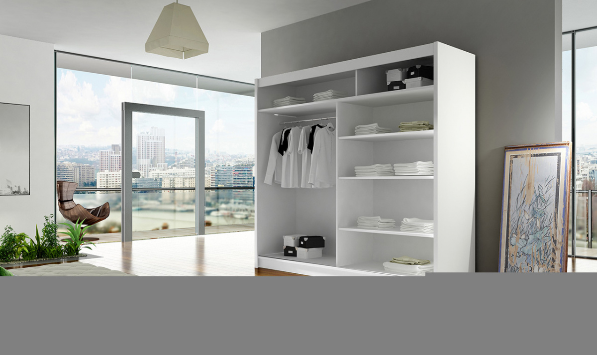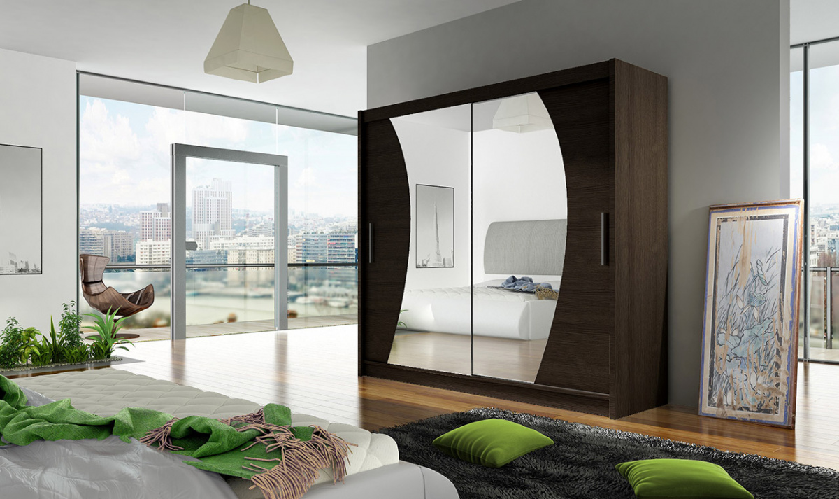 Skříň Berger s posuvnými dveřmi, je vyrobena z kvalitního lamina o síle 16 mm a hrany jsou ukončeny ABS lištou. Vodící lišty jsou vyrobeny z odolného hliníku a splňují požadavky pro každodenní užívání. Skříň je doplněna zrcadly zaříznutými do oblouku, která jí dodávají elegantní vzhled a místnost opticky zvětší a prosvětlí. Nabízíme ji ve čtyřech odstínech. Díky svým rozměrům a uspořádání poskytuje dostatek úložného prostoru. Skříň je dodávána v demontu a součástí je montážní plánek včetně všech potřebných spojovacích materiálů. Vyobrazené dekorace nejsou v ceně.