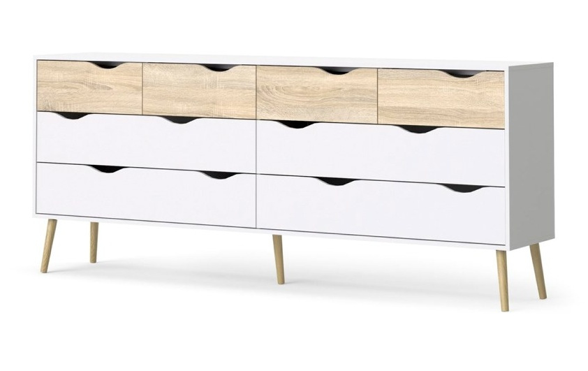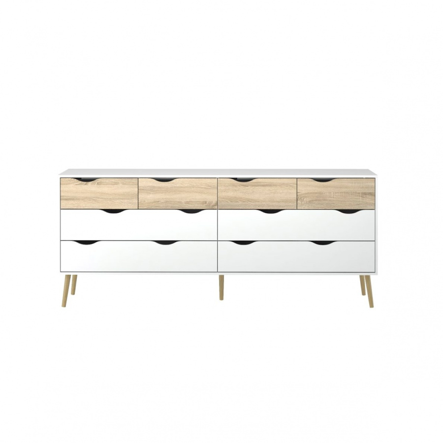 Pokud máte rádi Retro styl, pak je tato kolekce nábytku stvořena pro Vás. Nábytek je zhotoven z lamina o tl. 18 mm, které je odolné a snadné na údržbu. Díky rozmanitosti nabízených prvků, které kolekce Retro nabízí, si můžete sestavit obývací pokoj, jídelnu, ložnici, kancelář, nebo předsíň. Komoda díky svému provední nabízí univerzální použití a dostatek úložného prostoru. Díky tomu budete mít doma přehledný a organizovaný pořádek. Retro vzhled zdůrazňují vysoké šikmé nožky a obloukové výřezy místo úchytek. Komodu nabízíme ve dvou barevných provedeních. Je dodávaná v demontu a součástí je montážní plánek včetně všech potřebných spojovacích materiálů. Vyobrazené dekorace nejsou v ceně. Nábytek je dodáván z Dánska, proto doporučujeme ověřit dostupnost zboží.