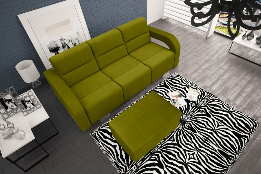 Pohovka Alza je rozkládací a součástí je i praktický úložný prostor a taburet. Zajímavé provedení područí, jí dodává lehkost a eleganci. Díky tomu nepůsobí mohutně a hodí se do každého interiéru. Výplň pohovky tvoří vlnité pružiny faliste v kombinaci s kvalitní PUR pěnou. Rozkládání je díky automatu jednoduché a po rozložení vznikne lůžko vhodné k příležitostnému přespání. Pohovku dodáváme v několika barevných provedeních, které také naleznete v naší nabídce. Rozpis rozměrů najdete na přiloženém obrázku s nákresem. V ceně pohovky je i vyobrazený taburet. Ostatní dekorace nejsou v ceně.