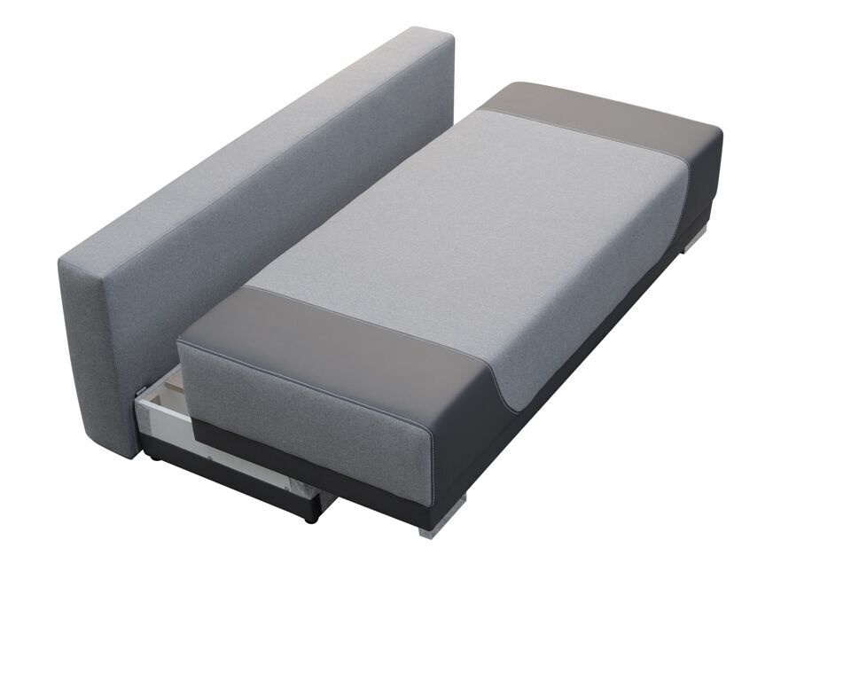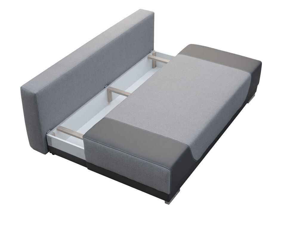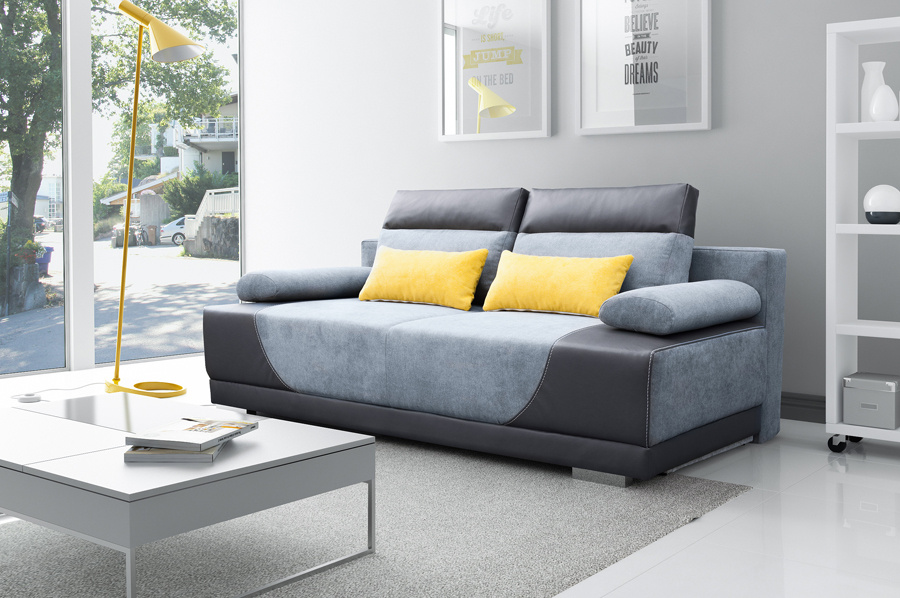 Moderní a velmi praktická rozkládací pohovka s úložným prostorem. Kombinace eko kůže a látky jí dodává zajímavý a moderní vzhled. Výplň pohovky tvoří pružiny bonell a faliste v kombinaci s kvalitní PUR pěnou. Jednoduchým rozkladem pomocí automatu vznikne lůžko vhodné k příležitostnému spaní. Pohovku dodáváme v několika barevných provedeních, které také naleznete v naší nabídce. V ceně pohovky jsou 2 velké opěrné polštáře, 2 polštáře po stranách, které plní funkci područí a dva malé žluté polštářky. Ostatní vyobrazené dekorace nejsou v ceně.