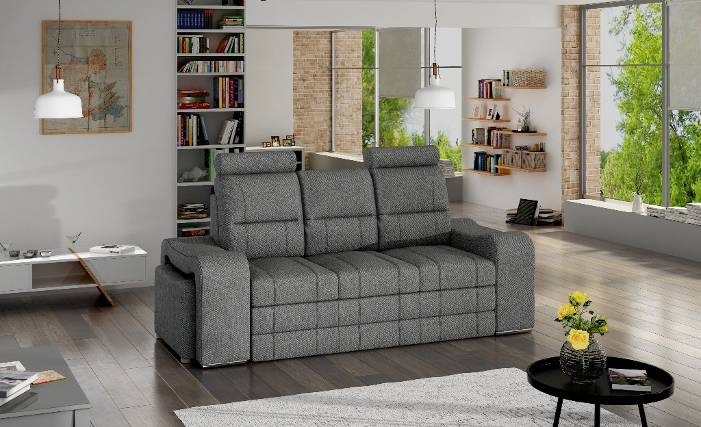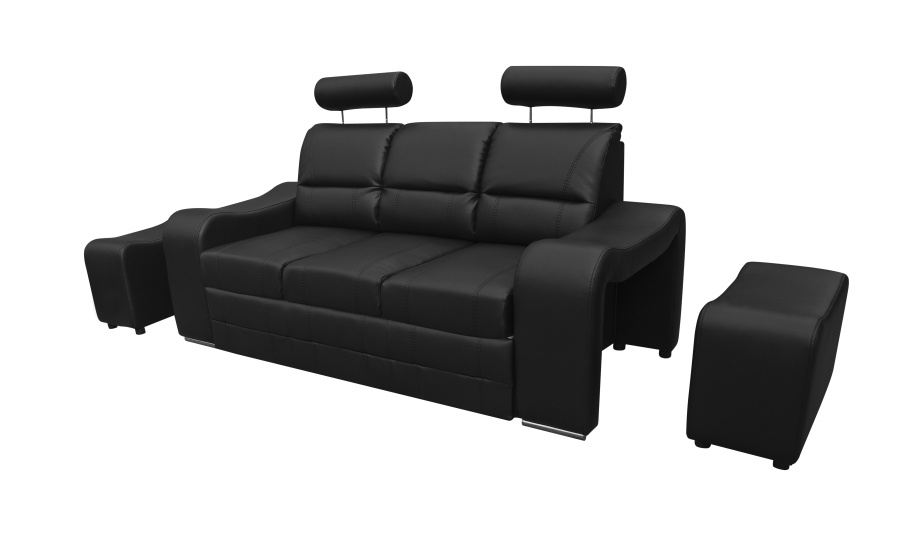 Pohovka Wenezie je určena pro ty, kteří mají rádi komfort a originalitu. Kombinace pružin faliste s kvalitní PUR pěnou, zajišťují velmi pohodlné sezení. Pohovka je rozkládací s úložným prostorem. Pohovku nabízíme v Eko kůži nebo látce, a to v několika barevných provedeních, které také naleznete v naší nabídce. V ceně pohovky jsou 2 taburety, které se dají ukrýt v područích pohovky a dvě výškově nastavitelné opěrky hlavy. Ostatní vyobrazené dekorace nejsou v ceně.