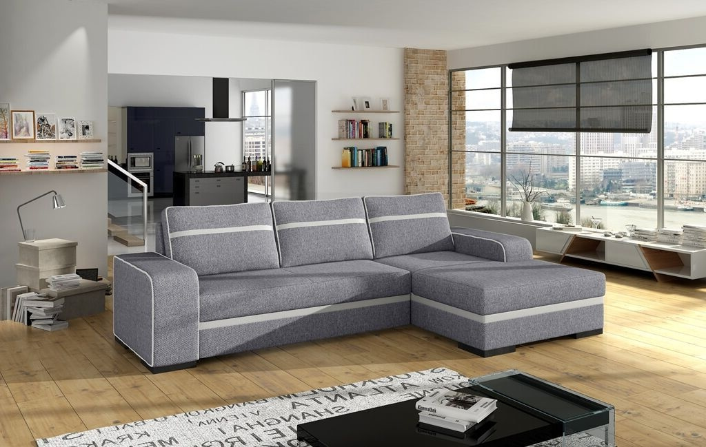 Elegantní rohová sedací souprava Funny je vhodná do každého interiéru. Umístit ji můžete ke stěně, nebo do prostoru. Sedací souprava je rozkládací a má také praktický úložný prostor. Jednoduchým rozložením vznikne dostatečně velké lůžko vhodné k příležitostnému spaní. Výplň sedáku tvoří pružiny faliste s kvalitní PUR pěnou. Tato kombinace zajistí pohodlné sezení. Sedací souprava je potažena velmi oblíbenou kvalitní látkou Inari. Zajímavým prvkem je proužek v kontrastní barvě, lemující sedací soupravu i polštáře. Tuto sedačku nabízíme v několika barevných variantách. V ceně sedací soupravy jsou 3 velké opěrné polštáře. Ostatní vyobrazené dekorace nejsou v ceně.
