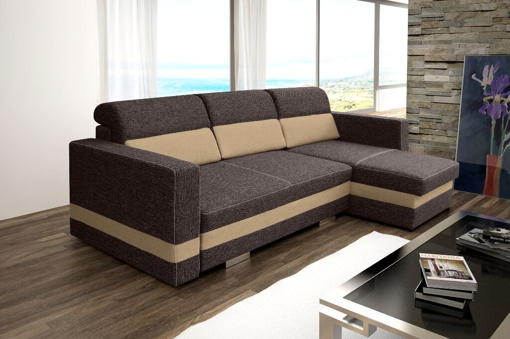 Elegantní rohová sedací souprava Rimini je rozkládací a má také 2 praktické úložné prostory. Díky svým rozměrům je vhodná i do menších pokojů. Jednoduchým rozložením pomocí automatu, vznikne dostatečně velké lůžko vhodné k příležitostnému spaní. Výplň sedáku tvoří kombinace pružin bonell s kvalitní PUR pěnou. Tato kombinace zajistí velmi pohodlné sezení. Sedací souprava je potažena kvalitní látkou v kombinaci 2 barev, a to v několika odstínech. V ceně sedací soupravy jsou 3 velké opěrné polštáře. Ostatní vyobrazené dekorace nejsou v ceně.
