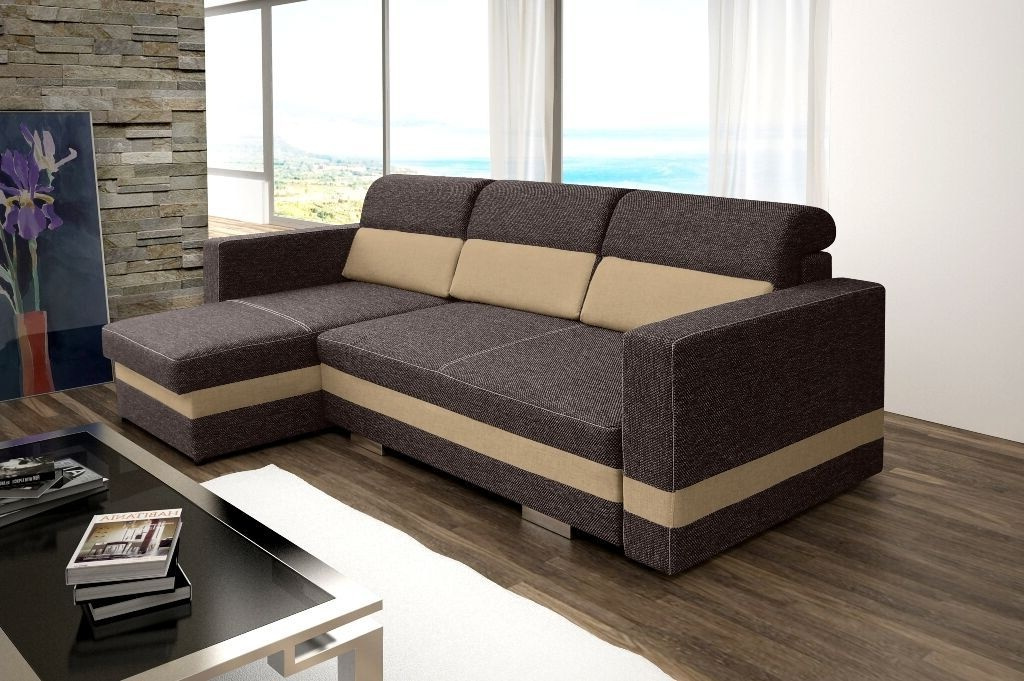 Elegantní rohová sedací souprava Rimini je rozkládací a má také 2 praktické úložné prostory. Díky svým rozměrům je vhodná i do menších pokojů. Jednoduchým rozložením pomocí automatu, vznikne dostatečně velké lůžko vhodné k příležitostnému spaní. Výplň sedáku tvoří kombinace pružin bonell s kvalitní PUR pěnou. Tato kombinace zajistí velmi pohodlné sezení. Sedací souprava je potažena kvalitní látkou v kombinaci 2 barev, a to v několika odstínech. V ceně sedací soupravy jsou 3 velké opěrné polštáře. Ostatní vyobrazené dekorace nejsou v ceně.