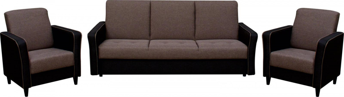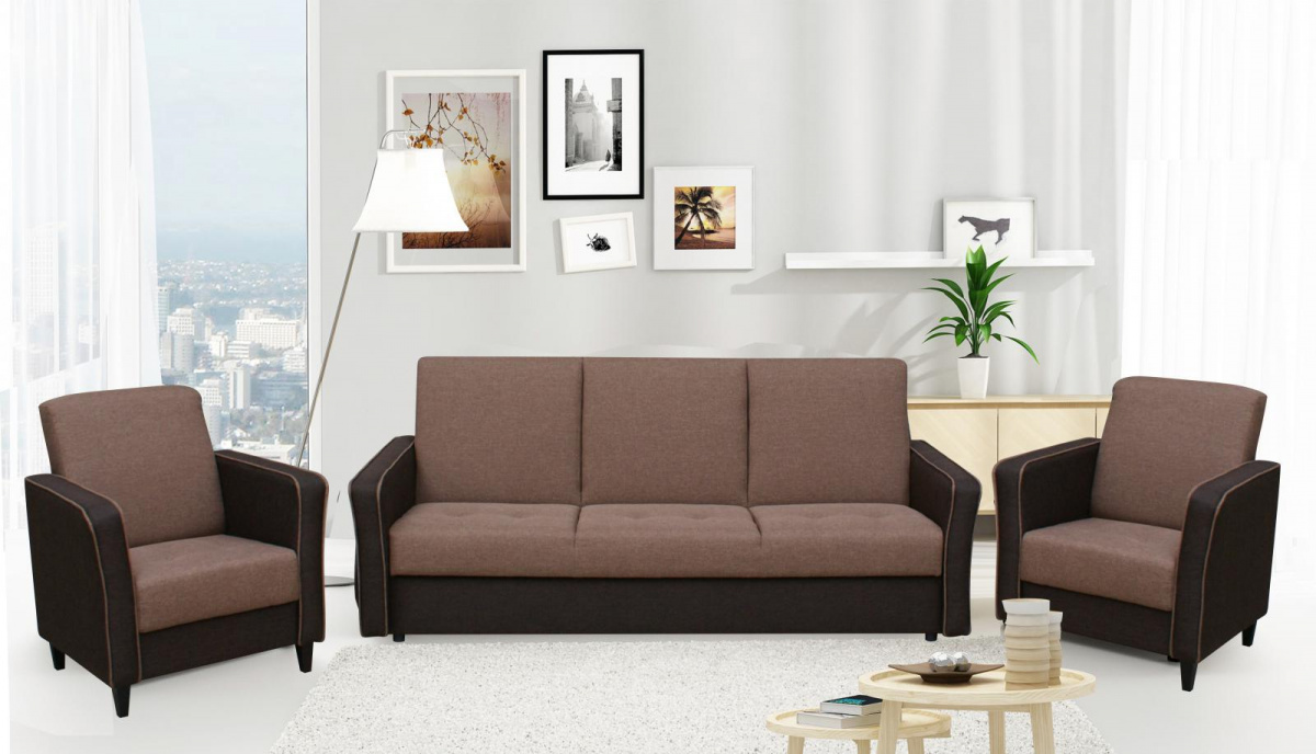 Sedací souprava Lada se skládá z trojsedu a dvou křesel. Soupravu snadno rozložite jednoduchým systémem KLIK-KLAK, kde získate lůžko k příležitostnému spaní. Plocha po rozložení je 185x115 cm. V trojsedu se nachází úložný prostor na lůžkoviny. Tato sedací souprava je očalouněná v kombinaci dvou barev tmavě a světle hnědé.
