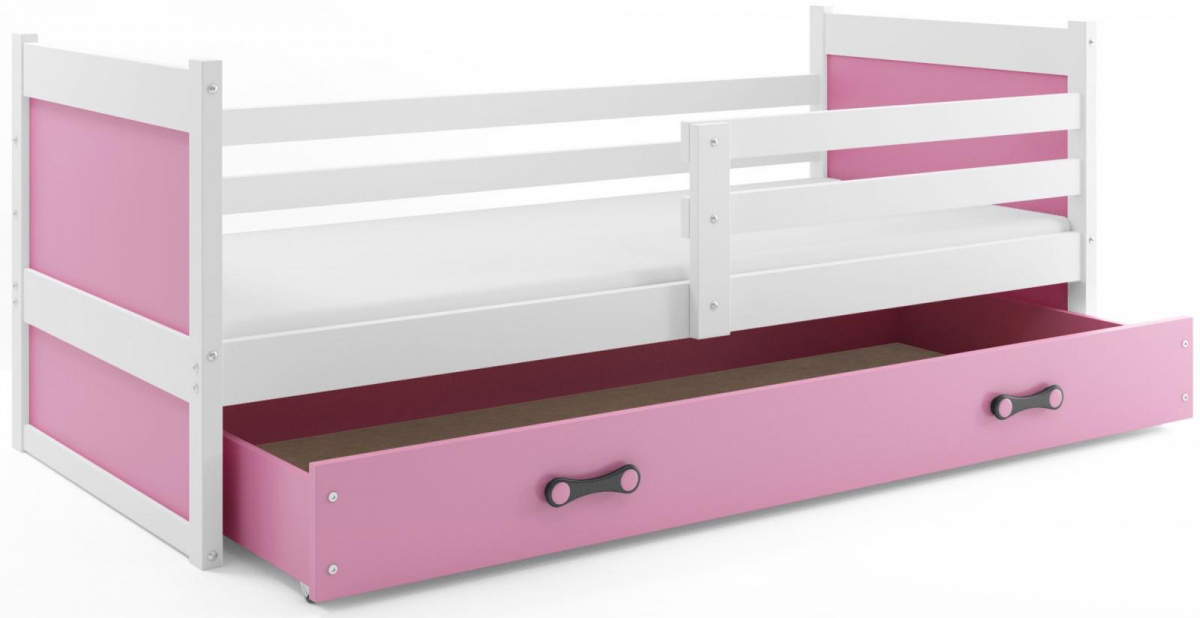 Dětská postel Riky je určena pro ty, kteří pro své dítě hledají funkčnost, moderní design a kvalitu. Postel je vyrobena z borovicového dřeva v kombinaci s MDF deskou (barevné panely na bocích postele). Její stabilní konstrukce, zaoblené hrany a zábrana, která je v ceně postele, zajišťují bezpečnost a pohodlí dítěte. Zábranu si můžete podle potřeby umístit na pravou, nebo levou stranu postele. Součástí postele je také praktický úložný prostor na kolečkách, rošt a pěnová matrace se snímatelným potahem. Plocha pro spaní je 90x200 cm. Postel je dodávána v demontu a součástí je montážní plánek včetně všech potřebných spojovacích materiálů. Vyobrazené dekorace nejsou v ceně. Zobrazení barev na fotografii se může od skutečnosti nepatrně lišit.