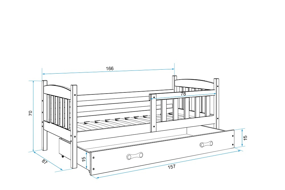 Dětská postel Kuba je určena pro ty, kteří pro své dítě hledají funkčnost, pohodlí a kvalitu. Postel je vyrobena z borovicového dřeva. Na lakování je použitý bezpečný, vodou ředitelný lak vyhovující normám. Její stabilní konstrukce, zaoblené hrany a zábrana, která je v ceně postele, zajišťují bezpečnost dítěte. Zábranu si můžete podle potřeby umístit na pravou, nebo levou stranu postele. Součástí postele je také praktický úložný prostor na kolečkách, rošt a pěnová matrace se snímatelným potahem. Plocha pro spaní je 80x160 cm. Postel je dodávána v demontu a součástí je montážní plánek včetně všech potřebných spojovacích materiálů. Vyobrazené dekorace nejsou v ceně.