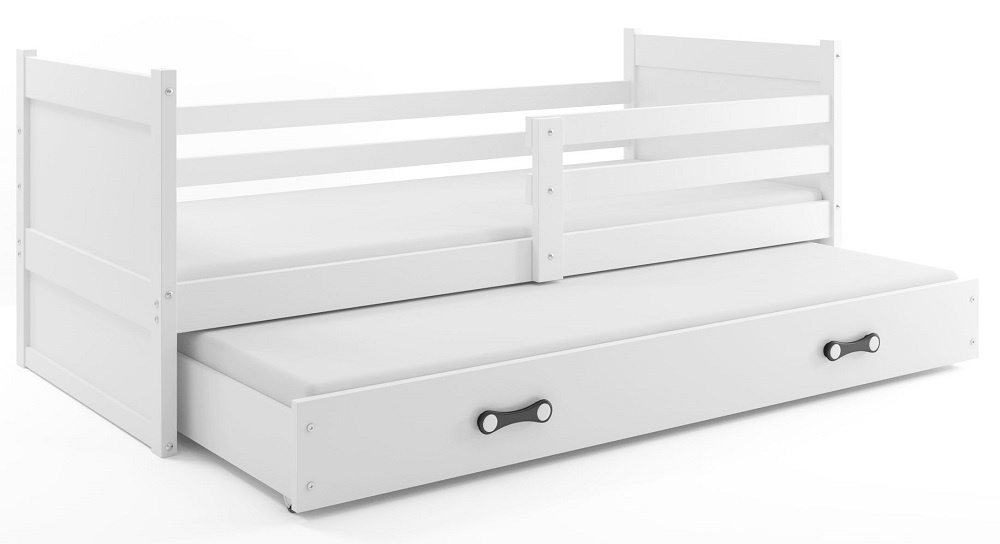 Dětská postel Riky II je určena pro ty, kteří pro své dítě hledají funkčnost, moderní design a kvalitu. Postel je vyrobena z borovicového dřeva v kombinaci s MDF deskou (barevné panely na bocích postele). Její stabilní konstrukce, zaoblené hrany a zábrana, která je v ceně postele, zajišťují bezpečnost a pohodlí dítěte. Zábranu si můžete podle potřeby umístit na pravou, nebo levou stranu postele. Součástí postele je také praktická přistýlka s matrací, kterou můžete využít pro druhé dítě, nebo když u Vašeho dítěte bude chtít přespat kamarád/ka. Obě části postele mají rošt a pěnovou matraci se snímatelným potahem. Plocha pro spaní je 90x200 cm (vrchní část) a 80x190 cm (přistýlka). Postel je dodávána v demontu a součástí je montážní plánek včetně všech potřebných spojovacích materiálů. Vyobrazené dekorace nejsou v ceně. Zobrazení barev na fotografii se může od skutečnosti nepatrně lišit.