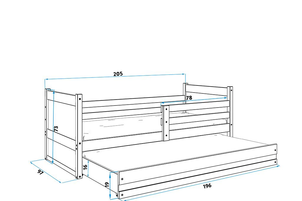 Dětská postel Riky II je určena pro ty, kteří pro své dítě hledají funkčnost, moderní design a kvalitu. Postel je vyrobena z borovicového dřeva v kombinaci s MDF deskou (barevné panely na bocích postele). Její stabilní konstrukce, zaoblené hrany a zábrana, která je v ceně postele, zajišťují bezpečnost a pohodlí dítěte. Zábranu si můžete podle potřeby umístit na pravou, nebo levou stranu postele. Součástí postele je také praktická přistýlka s matrací, kterou můžete využít pro druhé dítě, nebo když u Vašeho dítěte bude chtít přespat kamarád/ka. Obě části postele mají rošt a pěnovou matraci se snímatelným potahem. Plocha pro spaní je 90x200 cm (vrchní část) a 80x190 cm (přistýlka). Postel je dodávána v demontu a součástí je montážní plánek včetně všech potřebných spojovacích materiálů. Vyobrazené dekorace nejsou v ceně. Zobrazení barev na fotografii se může od skutečnosti nepatrně lišit.