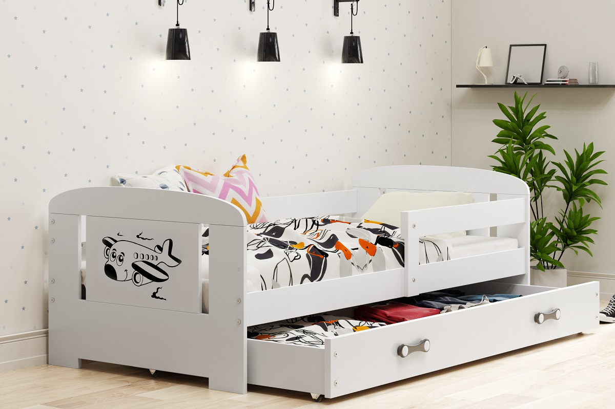 Dětská postel Bruno je určena pro ty, kteří pro své dítě hledají funkčnost, moderní design a kvalitu. Postel je vyrobena z borovicového dřeva v kombinaci s MDF deskou (bílé panely na bocích postele), na které je obrázek s dětským motivem pro kluky i holky. Dřevěná konstrukce je lakována vodou ředitelným lakem, který je vhodný na dětský nábytek a vyhovuje normám o nezávadnosti. Stabilní konstrukce postele, zaoblené hrany a zábrana, která je v ceně postele, zajišťují bezpečnost a pohodlí dítěte. Zábranu si můžete podle potřeby umístit na pravou, nebo levou stranu postele. Součástí postele je také praktický úložný prostor na kolečkách, rošt a pěnová matrace se snímatelným potahem. Plocha pro spaní je 80x160 cm. Postel je dodávána v demontu a součástí je montážní plánek včetně všech potřebných spojovacích materiálů. Vyobrazené doplňky a dekorace nejsou v ceně.