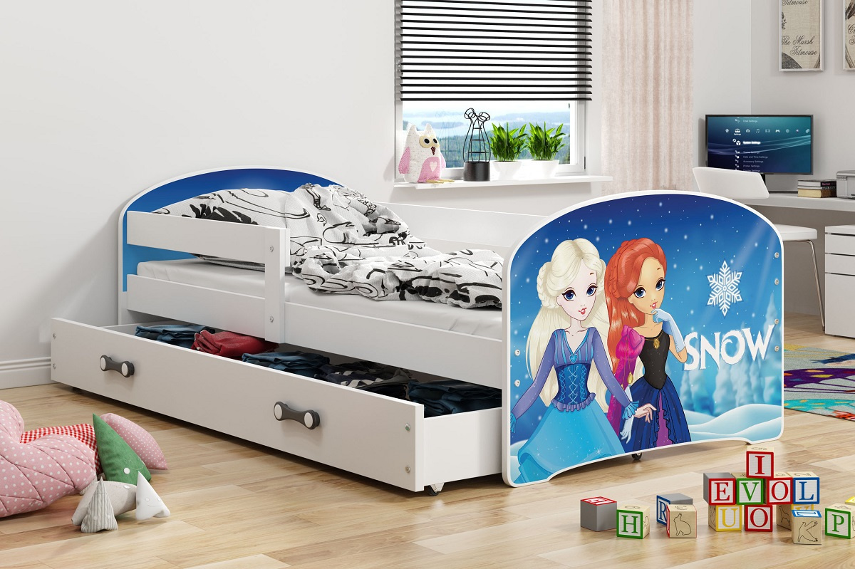 Dětská postel Hubert je určena pro ty, kteří pro své dítě hledají funkčnost, moderní design a kvalitu. Postel je vyrobena z borovicového dřeva v kombinaci s MDF deskou (bílé panely na bocích postele), na které se lepí obrázek s dětským motivem pro kluky i holky. Samolepky dodávané k posteli mají živé barvy s množstvím detailů. Vybírat můžete z velkého množství oblíbených hrdinů a postaviček z pohádek. Její stabilní konstrukce, zaoblené hrany a zábrana, která je v ceně postele, zajišťují bezpečnost a pohodlí dítěte. Zábranu si můžete podle potřeby umístit na pravou, nebo levou stranu postele. Součástí postele je také praktický úložný prostor na kolečkách, rošt a pěnová matrace se snímatelným potahem. Plocha pro spaní je 80x160 cm. Postel je dodávána v demontu a součástí je montážní plánek včetně všech potřebných spojovacích materiálů. Vyobrazené dekorace nejsou v ceně.