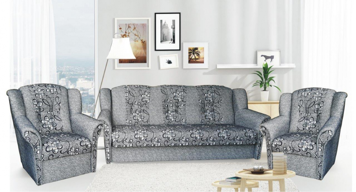 Klasická rozkládací sedací souprava vhodná také do menších bytů. Sedací souprava má praktický úložný prostor a jednoduchým rozkladem vznikne lůžko vhodné k příležitostnému spaní. Sedací souprava je pružinová v kombinaci s kvalitní PUR pěnou. Sedací souprava se skládá z rozkládacího trojsedu a dvou křesel. Tato sedačka je očalouněná kvalitní potahovou látkou, snadno čistitelnou suchou pěnou.