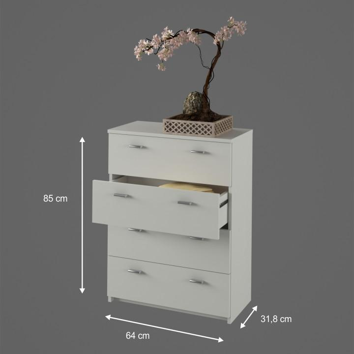 4-Zásuvková komoda. Rozměry (ŠxVxH): 64x85x31,8 cm, Materiál a barevné provedení: DTD laminovaná, bílá. Slovenský výrobek. Tloušťka materiálu: 16 mm