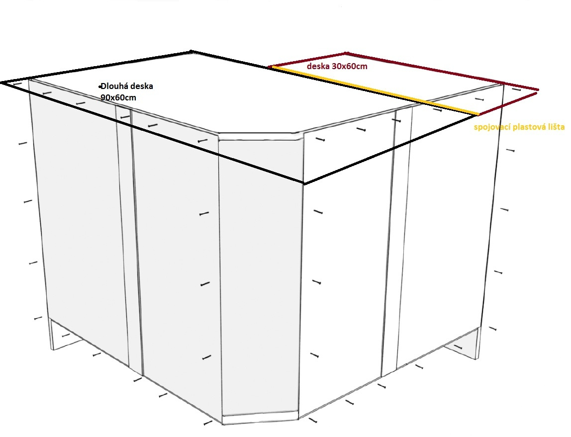 rohová skříňka 80x80 cm, v.83 cm Skutečný rozměr skříňky bez pracovní desky je 80x80 cm/ výška 83 cm, s pracovní deskou je rozměr 90x90 cm. V případě zájmu o dokoupení desky nad tuto skříňku, je potřeba objednat dělenou desku 90 a 30 cm.