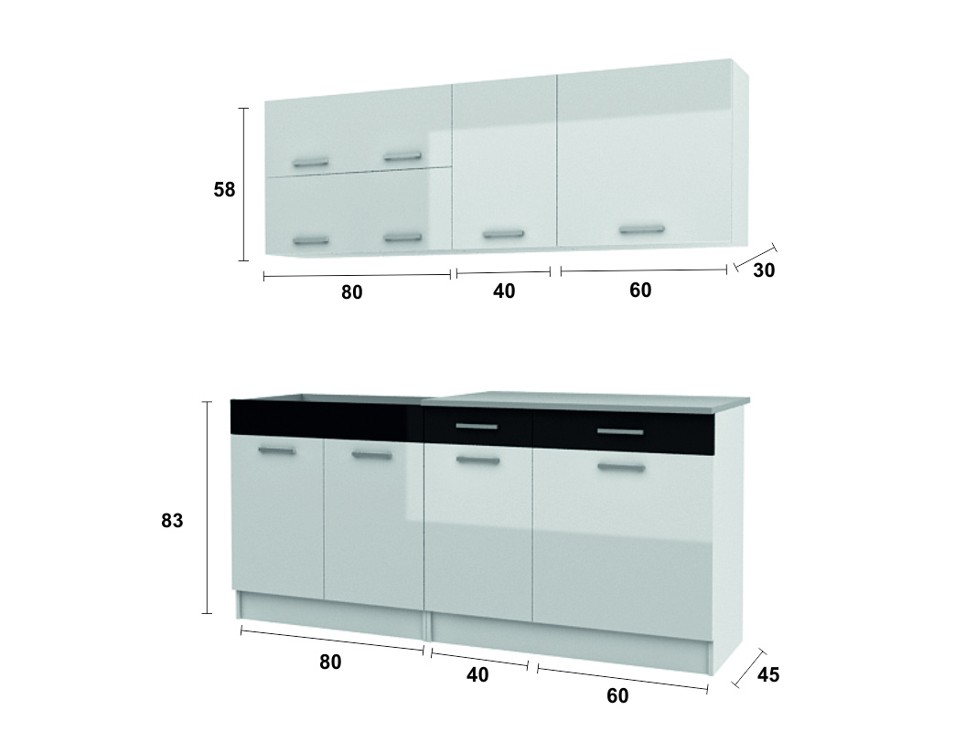 Potýkáte-li se s malými prostory a každý centimetr je pro Vás důležitý, pak je kuchyňská linka Gigue tou správnou volbou pro Vaši kuchyň. Je vyrobena v moderním designu a skříňky si můžete sestavit buď tak, jak vidíte na úvodní fotografii, nebo si je můžete sestavit podle svých potřeb. Korpusy skříněk jsou bílé, dvířka jsou ve vysokém lesku bílé barvy, v kombinaci s černou. Všechny skříňky této sestavy jsou dodávány v demontu. Součástí je montážní plánek včetně všech potřebných spojovacích materiálů. Cena je uvedna za sestavu vyobrazenou na úvodní fotografii BEZ PRACOVNÍ DESKY. Spotřebiče,baterie a dekorace nejsou v ceně.