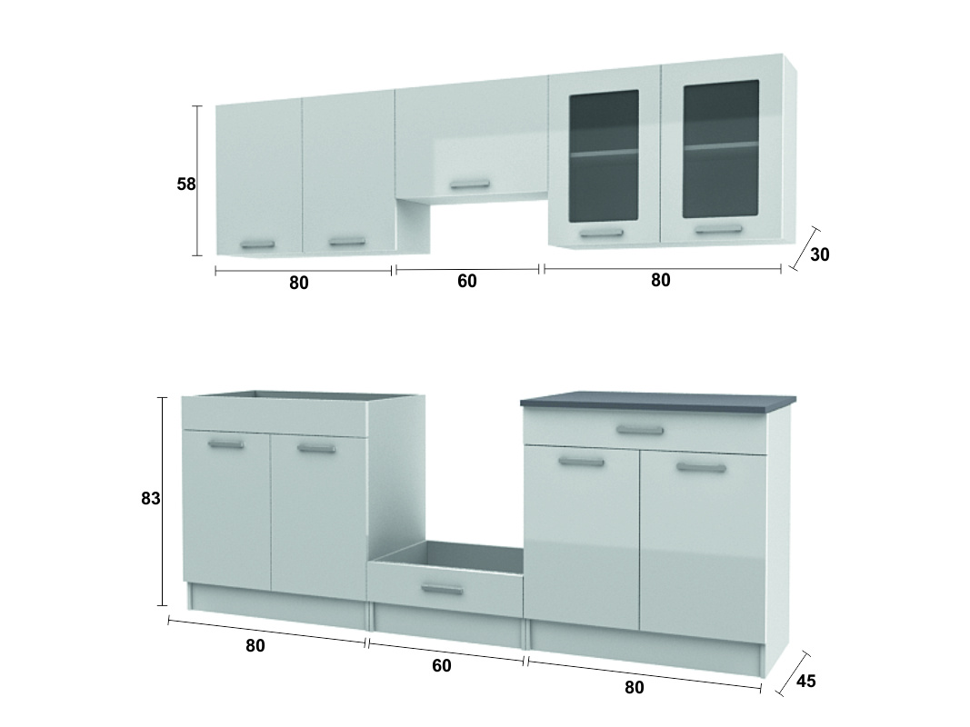 Kuchyňská linka Vicenza je vyrobena v moderním designu. Je ideální volbou pro panelákové kuchyně, ale hodí se i do kuchyní v rodinných domech. Korpusy skříněk jsou bílé, dvířka jsou ve vysokém lesku. Skříňky jsou dodávány v demontu. Součástí je montážní plánek včetně všech potřebných spojovacích materiálů. Cena je uvedna za sestavu vyobrazenou na úvodní fotografii BEZ PRACOVNÍ DESKY. Spotřebiče,baterie a dekorace nejsou v ceně.