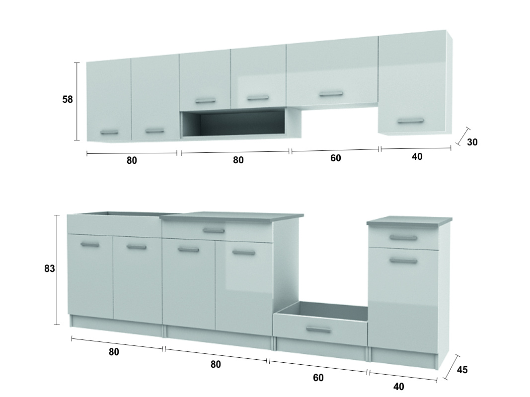 Kuchyňská linka Carrie je praktická, účelná a navíc za rozumnou cenu. Kuchyňská linka je důležitým vybavením Vaší kuchyně, ale také designovým prvkem interiéru. Ať už to bude v paneláku, nebo rodinném domě, určitě se bude ve Vaší kuchyni krásně vyjímat. Skříňky nabízejí dostatek úložného prostoru na nádobí i dostatek pracovního prostoru. Kuchyň je vyrobená z lamina, které je odolné a snadné na údržbu. Korpusy skříněk jsou bílé, dvířka jsou ve vysokém lesku v trendy barvách. Skříňky jsou samostatné, takže si kuchyň můžete sestavit buď tak, jak je vyobrazeno na fotografii, nebo si je můžete sestavit podle toho, jak Vám to bude vyhovovat. Kuchyň je dodávána v demontu BEZ PRACOVNÍ DESKY. Součástí je montážní plánek včetně všech potřebných spojovacích materiálů. Cena je uvedna za sestavu vyobrazenou na úvodní fotografii. Spotřebiče,baterie a dekorace nejsou v ceně.