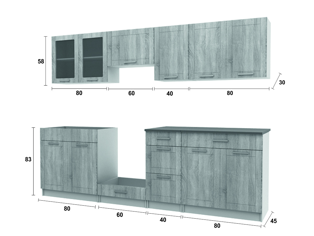 Kuchyňská linka Moneta v klasickém designu, je praktická, účelná a navíc za rozumnou cenu. Kuchyňská linka je důležitým vybavením Vaší kuchyně, ale také designovým prvkem interiéru. Ať už to bude v paneláku, nebo rodinném domě, určitě se bude ve Vaší kuchyni krásně vyjímat. Skříňky nabízejí dostatek úložného prostoru na nádobí i dostatek pracovního prostoru. Kuchyň je vyrobená z lamina, které je odolné a snadné na údržbu. Korpusy skříněk jsou bílé, dvířka jsou v dekoru dřeva. Skříňky jsou samostatné, takže si kuchyň můžete sestavit buď tak, jak je vyobrazeno na fotografii, nebo si je můžete sestavit podle toho, jak Vám to bude vyhovovat. Kuchyň je dodávána v demontu BEZ PRACOVNÍ DESKY. Součástí je montážní plánek včetně všech potřebných spojovacích materiálů. Cena je uvedna za sestavu vyobrazenou na úvodní fotografii. Spotřebiče,baterie a dekorace nejsou v ceně.