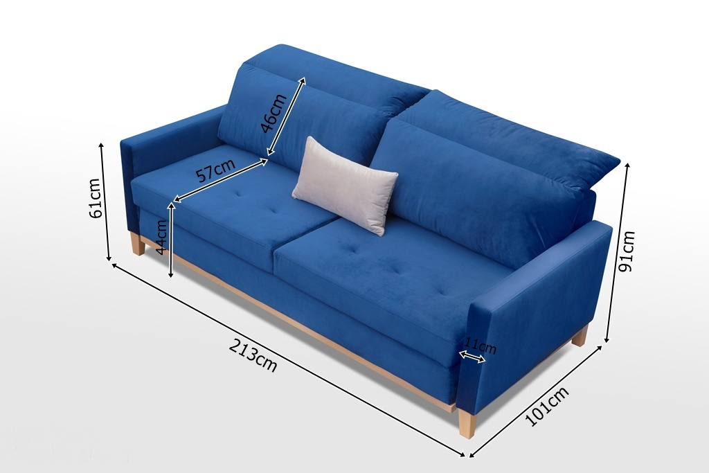 Pohovka Ajax v moderním nadčasovém designu vyniká elegancí a pohodlím a hodí se do každého interiéru. Zajímavým detailem je prošití polštáře a kombinace s přírodním dřevem, které se na modré barvě krásně vyjímá. Výplň sedáku tvoří kombinace vlnitých pružin faliste s kvalitní PUR pěnou. Pohovka je rozkládací a samozřejmostí je i praktický úložný prostor na lůžkoviny. Jednoduchým rozložením pomocí automatu, vznikne dostatečně velké lůžko k občasnému přespání Vaší návštěvy. Návod na rozložení najdete v krátkém gifu, který je v doplňkových fotografiích. Pohovku nabízíme v několika barvách, odstín moření dřeva není možno měnit. Součástí pohovky jsou dva velké opěrné polštáře a jeden malý dekorační polštářek. Ostatní vyobrazené dekorace nejsou v ceně.