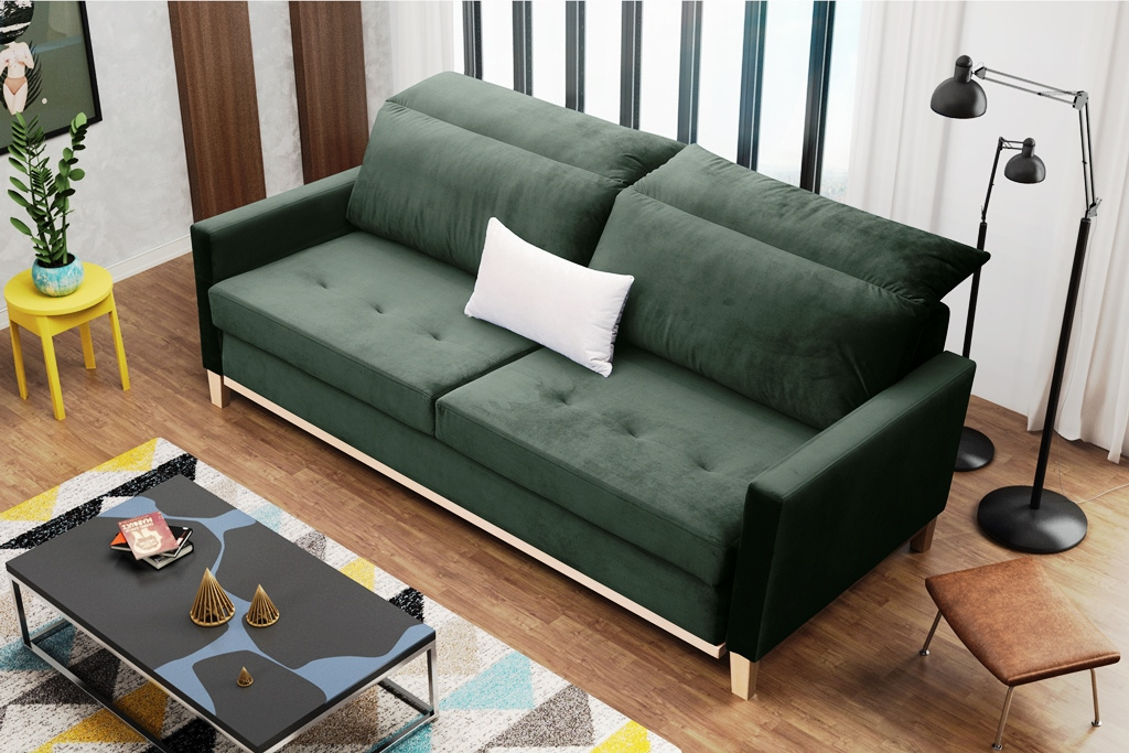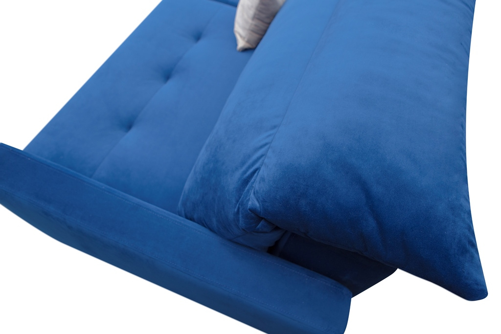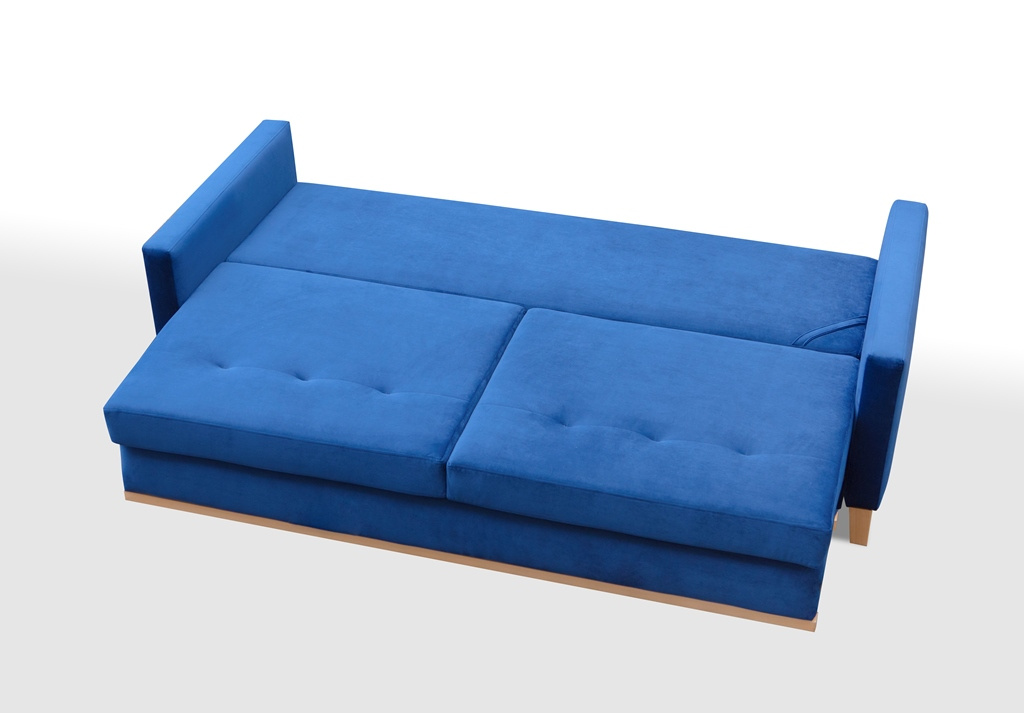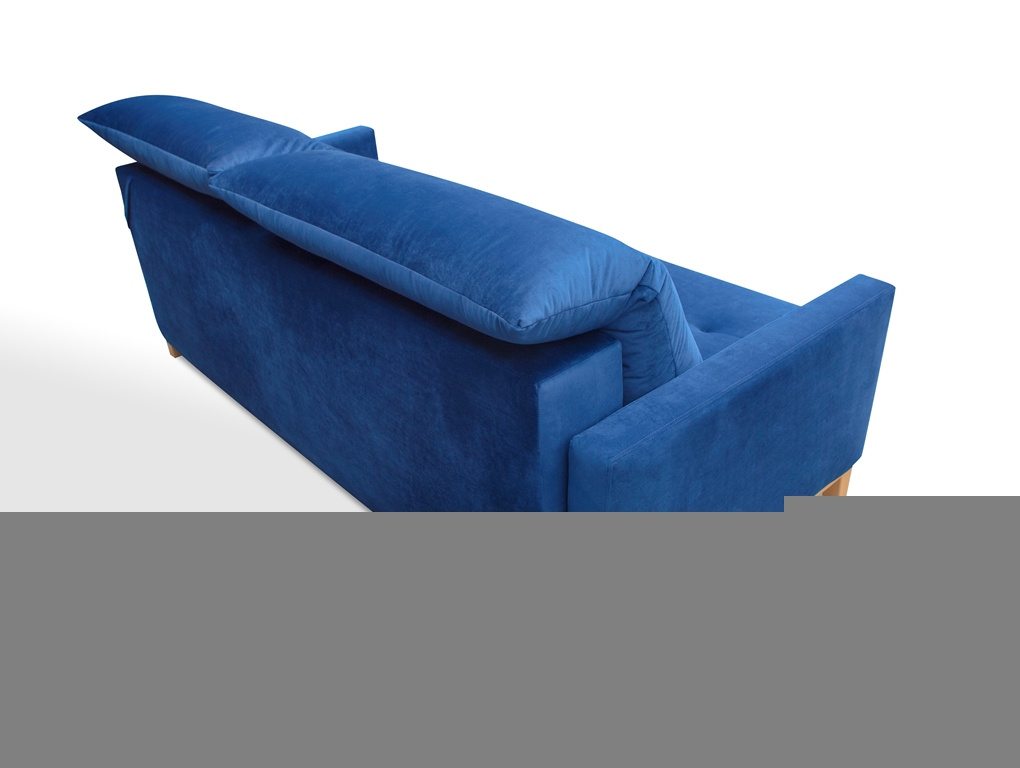 Pohovka Ajax v moderním nadčasovém designu vyniká elegancí a pohodlím a hodí se do každého interiéru. Zajímavým detailem je prošití polštáře a kombinace s přírodním dřevem, které se na modré barvě krásně vyjímá. Výplň sedáku tvoří kombinace vlnitých pružin faliste s kvalitní PUR pěnou. Pohovka je rozkládací a samozřejmostí je i praktický úložný prostor na lůžkoviny. Jednoduchým rozložením pomocí automatu, vznikne dostatečně velké lůžko k občasnému přespání Vaší návštěvy. Návod na rozložení najdete v krátkém gifu, který je v doplňkových fotografiích. Pohovku nabízíme v několika barvách, odstín moření dřeva není možno měnit. Součástí pohovky jsou dva velké opěrné polštáře a jeden malý dekorační polštářek. Ostatní vyobrazené dekorace nejsou v ceně.