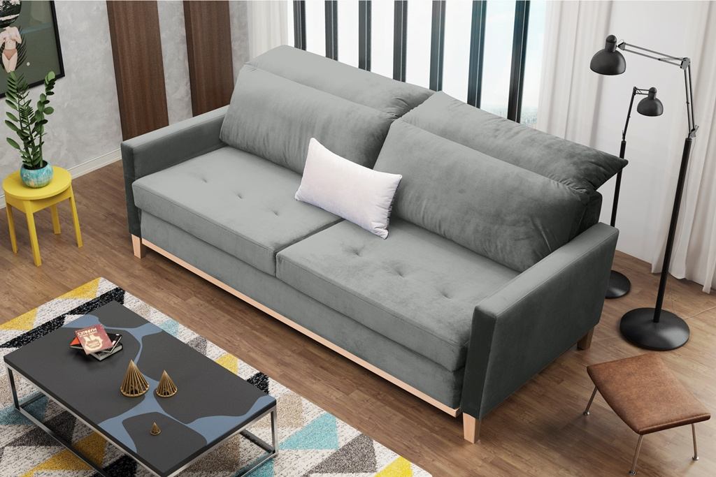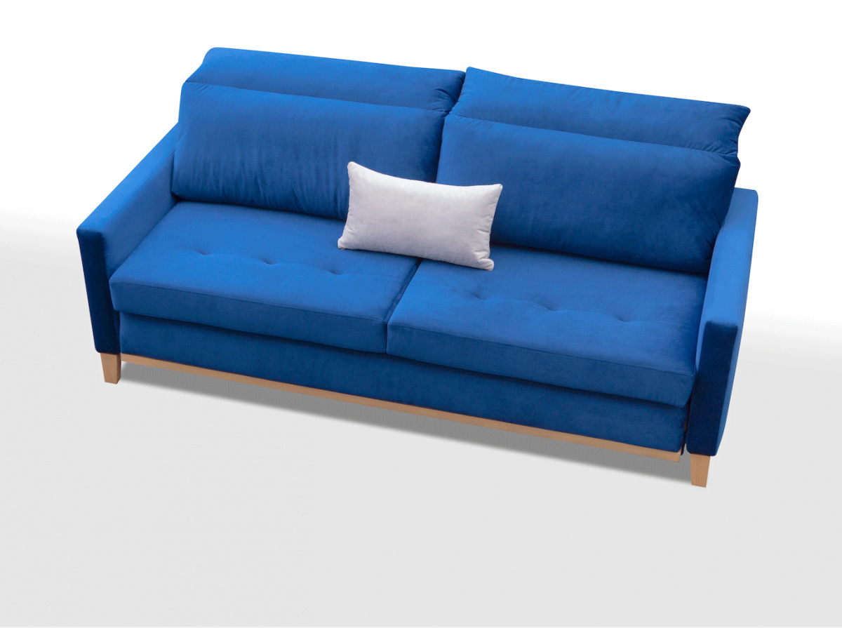 Pohovka Ajax v moderním nadčasovém designu vyniká elegancí a pohodlím a hodí se do každého interiéru. Zajímavým detailem je prošití polštáře a kombinace s přírodním dřevem, které se na modré barvě krásně vyjímá. Výplň sedáku tvoří kombinace vlnitých pružin faliste s kvalitní PUR pěnou. Pohovka je rozkládací a samozřejmostí je i praktický úložný prostor na lůžkoviny. Jednoduchým rozložením pomocí automatu, vznikne dostatečně velké lůžko k občasnému přespání Vaší návštěvy. Návod na rozložení najdete v krátkém gifu, který je v doplňkových fotografiích. Pohovku nabízíme v několika barvách, odstín moření dřeva není možno měnit. Součástí pohovky jsou dva velké opěrné polštáře a jeden malý dekorační polštářek. Ostatní vyobrazené dekorace nejsou v ceně.