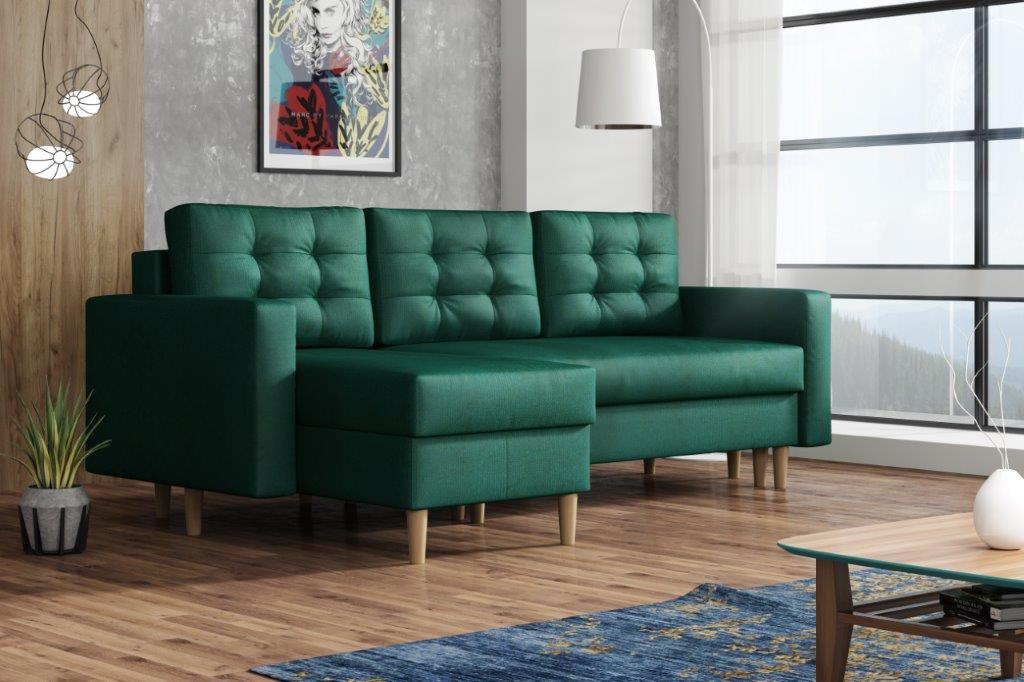 Sedací souprava Anabel je krásným designovým RETRO kouskem, který výborně zapadne do moderního i klasického interiéru. Retro design podtrhují dřevěné nohy a vtahy na opěrných polštářích. Její velkou předností je pohodlí, praktičnost a univerzální použití. Tzn. že si ji můžete podle potřeby sestavit jako levou nebo pravou, což je výhoda při zařizování obývacího pokoje. Nemusíte přemýšlet do jakého rohu postavíte sedací soupravu, jednoduše ji podle potřeby přizpůsobíte. Sedací souprava je rozkládací a může tak sloužit k občasnému přespání Vaší návštěvy. Samozřejmostí je i praktický úložný prostor, který je v obou částech sedačky a můžete ho využít např. na lůžkoviny. Sedací souprava je potažena látkou a nabízíme v několika oblíbených barvách. Výplň sedáků tvoří kombinace pružin s kvalitní PUR pěnou, což zajišťuje velmi pohodlné sezení. Sedací souprava je vhodná i do menších pokojů. Vyobrazené doplňky a dekorace nejsou v ceně. Zobrazení barev produktu na fotograii se může nepatrně lišit od skutečnosti.