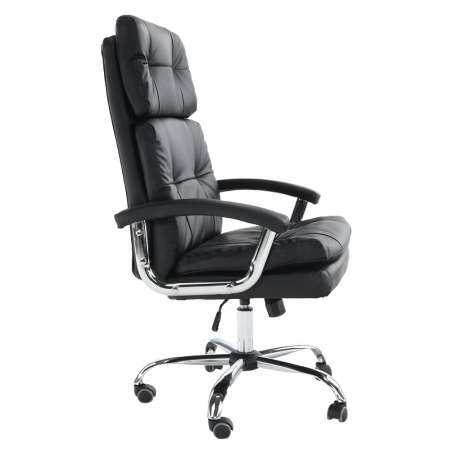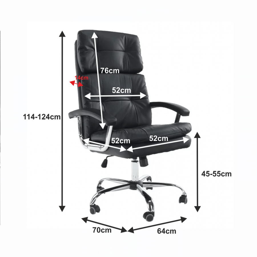 Pohodlné kancelářské křeslo. Materiál: Ekokůže / kov Barva: černá Rozměry: (ŠxHxV): 64x70x114-124 cm Výška sedu: 45-55 cm Hloubka sedu: 52 cm Hmotnost: 15 kg Nosnost: 110 kg Opěrka zad (ŠxV): 52x76 cm Sedadlo (ŠxH): 52x52 cm Dodávána v demontu.