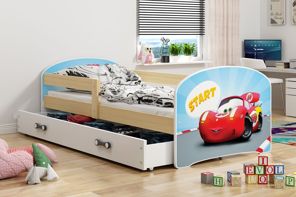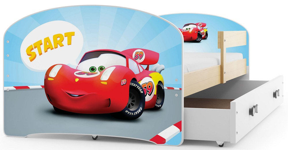 Dětská postel Hubert je určena pro ty, kteří pro své dítě hledají funkčnost, moderní design a kvalitu. Postel je vyrobena z borovicového dřeva v kombinaci s MDF deskou (bílé panely na bocích postele), na které se lepí obrázek s dětským motivem pro kluky i holky. Samolepky dodávané k posteli mají živé barvy s množstvím detailů. Vybírat můžete z velkého množství oblíbených hrdinů a postaviček z pohádek. Její stabilní konstrukce, zaoblené hrany a zábrana, která je v ceně postele, zajišťují bezpečnost a pohodlí dítěte. Zábranu si můžete podle potřeby umístit na pravou, nebo levou stranu postele. Součástí postele je také praktický úložný prostor na kolečkách, rošt a pěnová matrace se snímatelným potahem. Plocha pro spaní je 80x160 cm. Postel je dodávána v demontu a součástí je montážní plánek včetně všech potřebných spojovacích materiálů. Vyobrazené dekorace nejsou v ceně.