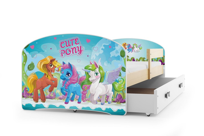 Dětská postel Hubert je určena pro ty, kteří pro své dítě hledají funkčnost, moderní design a kvalitu. Postel je vyrobena z borovicového dřeva v kombinaci s MDF deskou (bílé panely na bocích postele), na které se lepí obrázek s dětským motivem pro kluky i holky. Samolepky dodávané k posteli mají živé barvy s množstvím detailů. Vybírat můžete z velkého množství oblíbených hrdinů a postaviček z pohádek. Její stabilní konstrukce, zaoblené hrany a zábrana, která je v ceně postele, zajišťují bezpečnost a pohodlí dítěte. Zábranu si můžete podle potřeby umístit na pravou, nebo levou stranu postele. Součástí postele je také praktický úložný prostor na kolečkách, rošt a pěnová matrace se snímatelným potahem. Plocha pro spaní je 80x160 cm. Postel je dodávána v demontu a součástí je montážní plánek včetně všech potřebných spojovacích materiálů. Vyobrazené dekorace nejsou v ceně. Úvodní fotografie je ilustrační. Postel bude dodána s bílým úložným prostorem - viz doplňková fotografie.