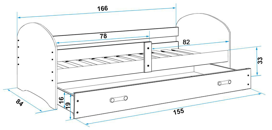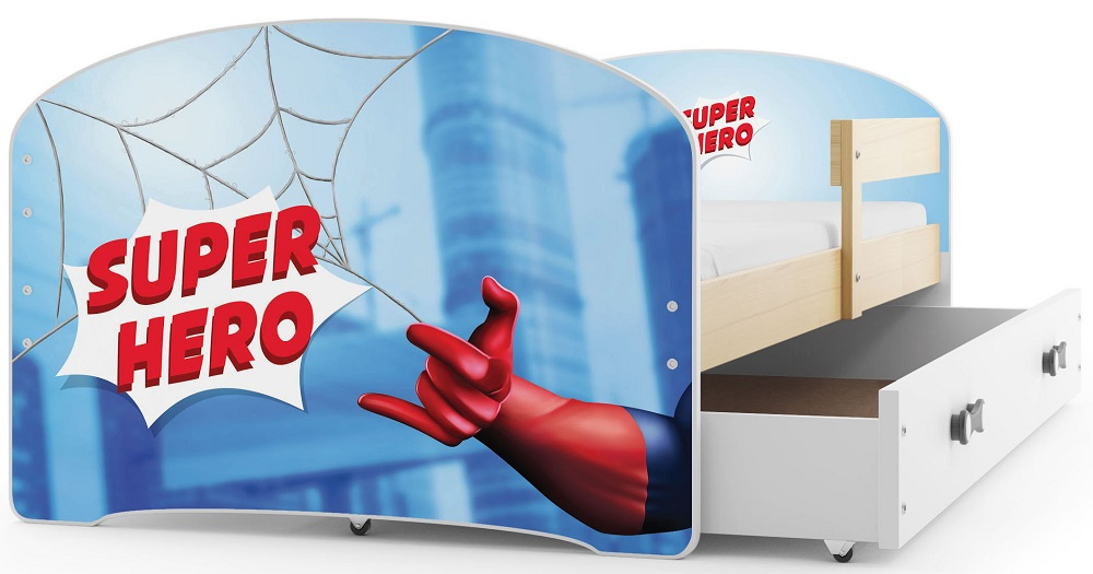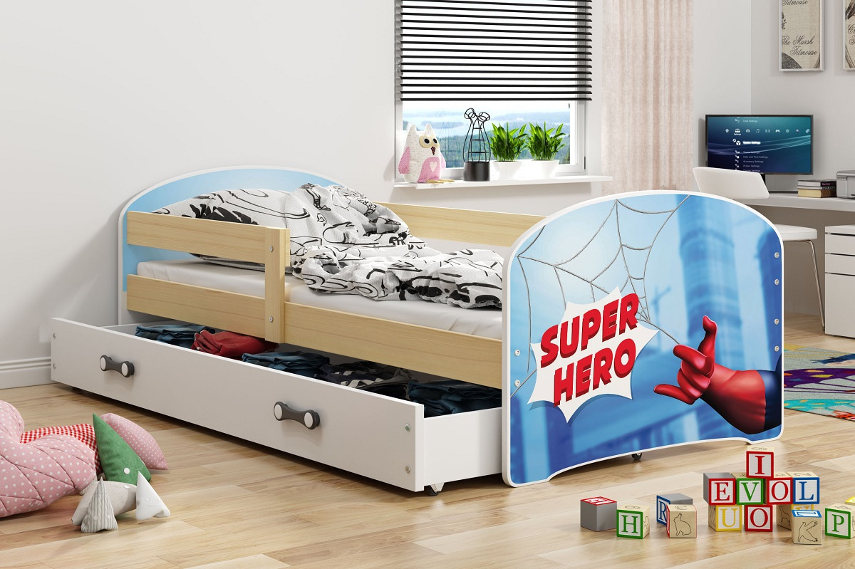 Dětská postel Hubert je určena pro ty, kteří pro své dítě hledají funkčnost, moderní design a kvalitu. Postel je vyrobena z borovicového dřeva v kombinaci s MDF deskou (bílé panely na bocích postele), na které se lepí obrázek s dětským motivem pro kluky i holky. Samolepky dodávané k posteli mají živé barvy s množstvím detailů. Vybírat můžete z velkého množství oblíbených hrdinů a postaviček z pohádek. Její stabilní konstrukce, zaoblené hrany a zábrana, která je v ceně postele, zajišťují bezpečnost a pohodlí dítěte. Zábranu si můžete podle potřeby umístit na pravou, nebo levou stranu postele. Součástí postele je také praktický úložný prostor na kolečkách, rošt a pěnová matrace se snímatelným potahem. Plocha pro spaní je 80x160 cm. Postel je dodávána v demontu a součástí je montážní plánek včetně všech potřebných spojovacích materiálů. Vyobrazené dekorace nejsou v ceně.