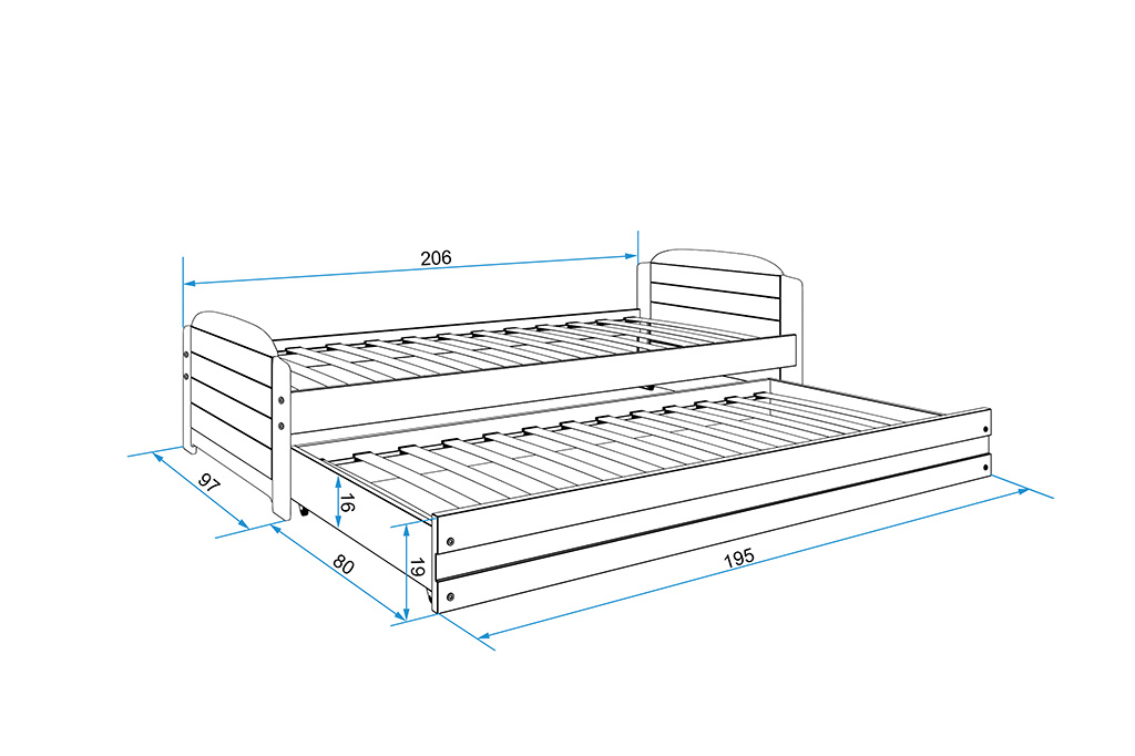 Postel Lizzie je vyrobena z borovicového dřeva, které je barveno a lakováno vodou ředitelným lakem, který je vhodný na dětský nábytek a vyhovuje normám o nezávadnosti. Panely Na bocích postele jsou vyrobeny z kvalitní MDF desky. Součástí postele je také praktická přistýlka s matrací, kterou můžete využít pro druhé dítě, nebo když u Vašeho dítěte bude chtít přespat kamarád/ka. Obě části postele mají rošt a pěnovou matraci s doporučenou nosností 70 kg. Plocha pro spaní je 90x200 cm (vrchní část) a 80x190 cm (přistýlka). Postel je dodávána v demontu a součástí je montážní plánek včetně všech potřebných spojovacích materiálů. Postel nabízíme ve dvou barevných provedeních a také s úložným prostorem bez přistýlky. Vyobrazené doplňky a dekorace nejsou v ceně.