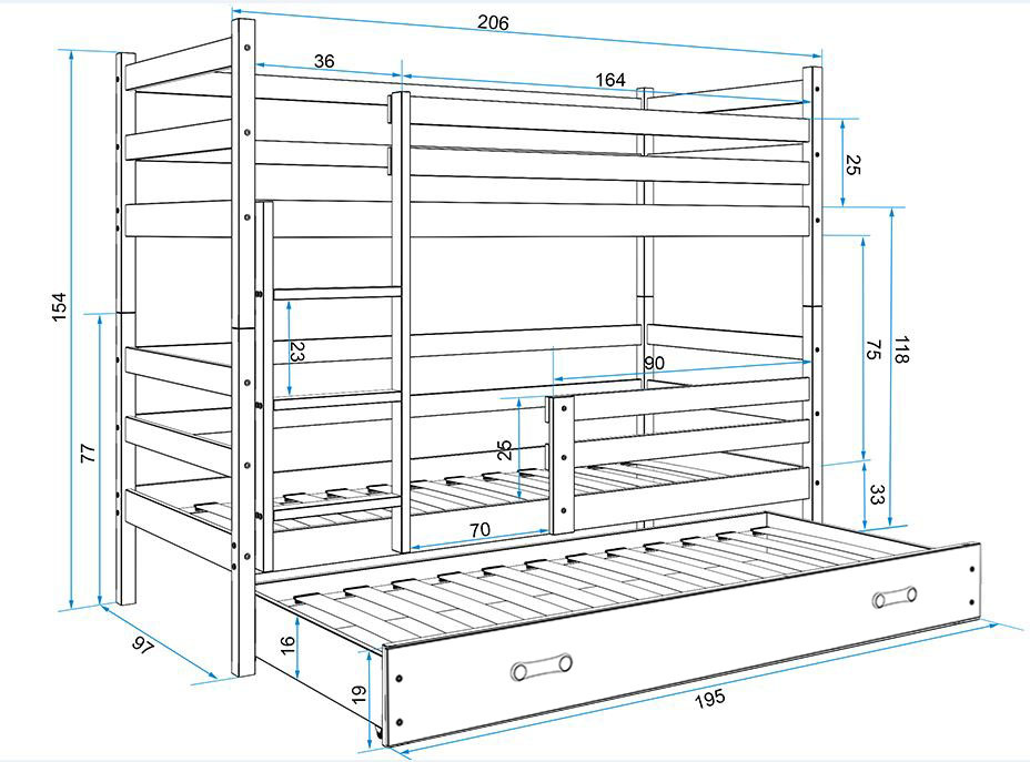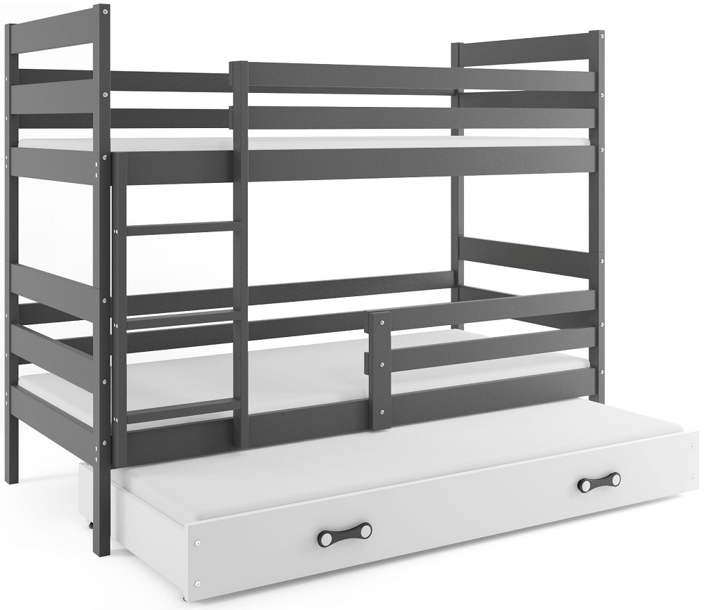Dětská patrová postel Norbert je určena pro ty, kteří pro své dítě hledají funkčnost, moderní design a kvalitu. Postel je vyrobena z kvalitního borovicového dřeva. Její stabilní konstrukce, zaoblené hrany a zábrana na horní i dolní posteli, zajišťují bezpečnost a pohodlí dítěte. Žebřík si můžete podle potřeby umístit na pravou, nebo levou stranu postele. Když děti patrová postel omrzí, je možno palandu rozložit na dvě samostatné postele. Součástí postele je také praktická přistýlka s matrací, kterou můžete využít pro další dítě, nebo když u Vašeho dítěte bude chtít přespat kamarád/ka. Všechny části postele mají rošt a pěnovou matraci v ceně. Plocha pro spaní je 90x200 cm (vrchní a spodní část) a 80x190 cm (přistýlka). Postel je dodávána v demontu a součástí je montážní plánek včetně všech potřebných spojovacích materiálů. Vyobrazené dekorace nejsou v ceně.