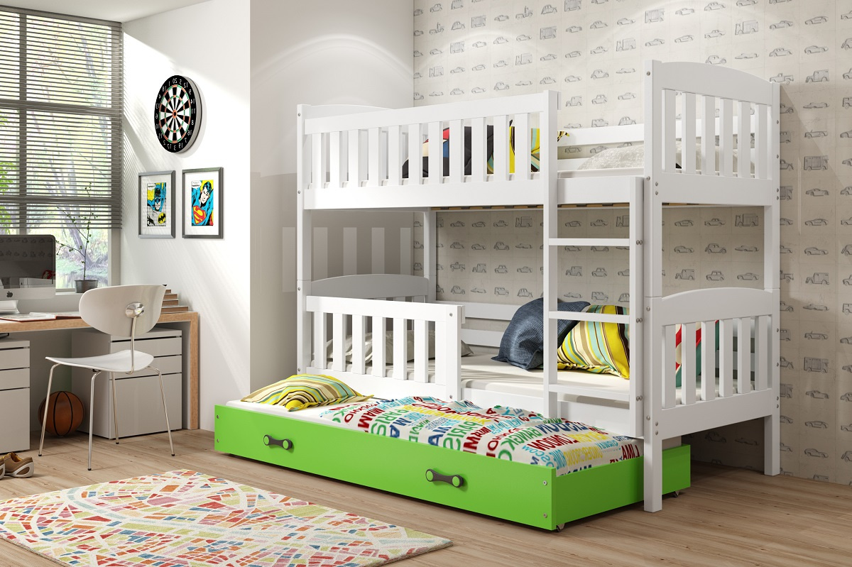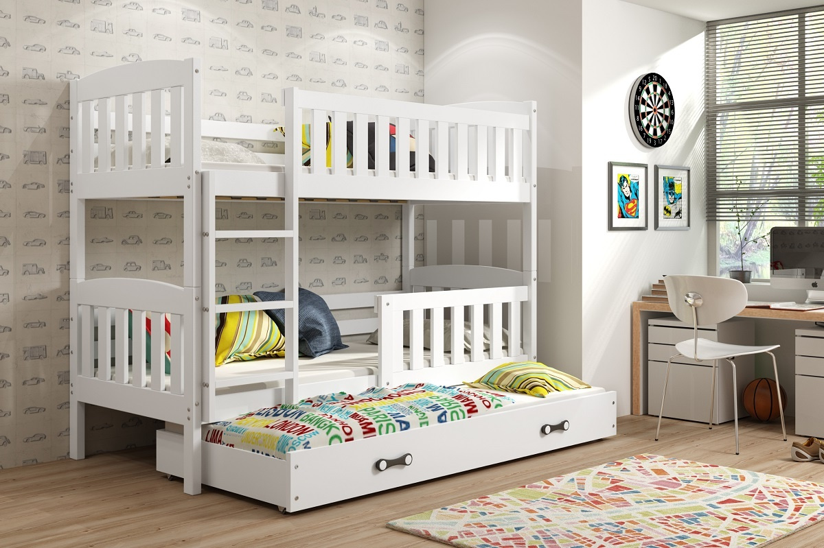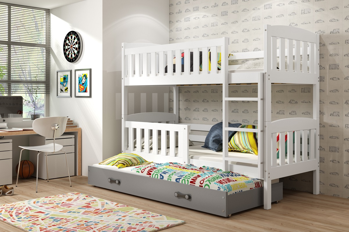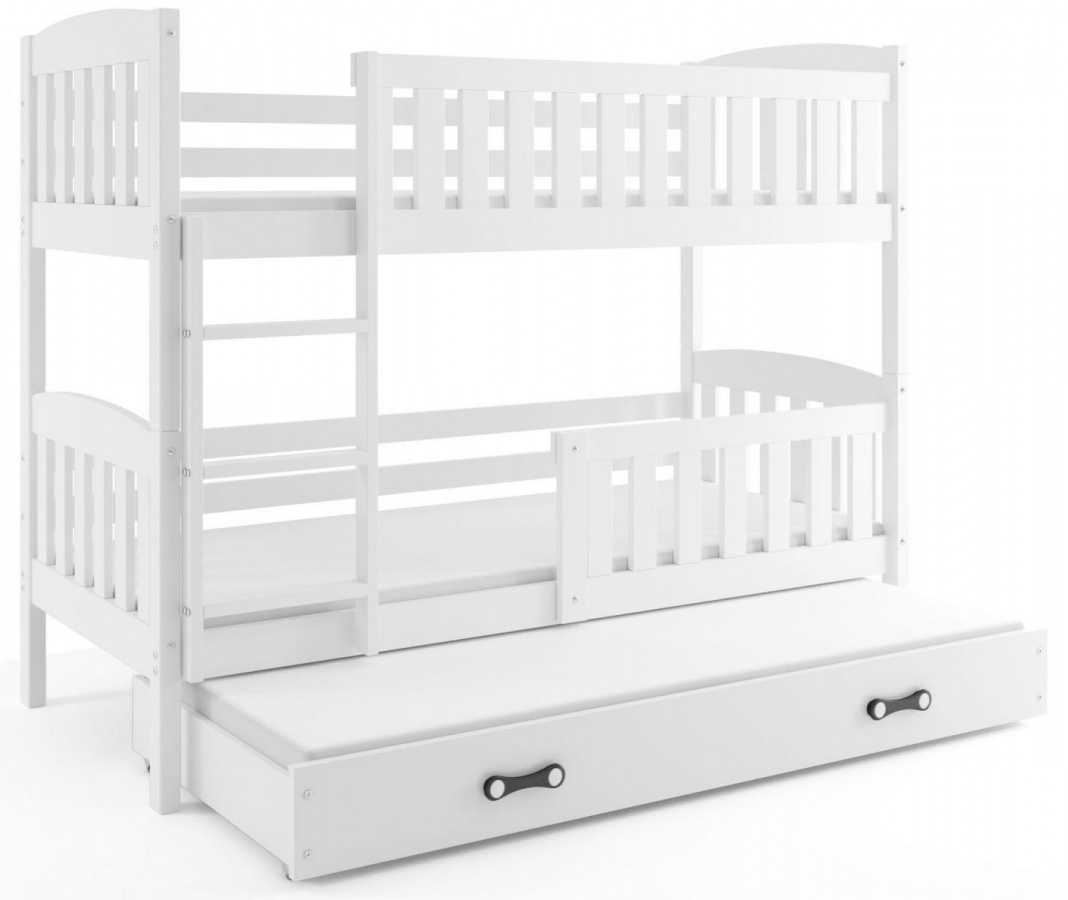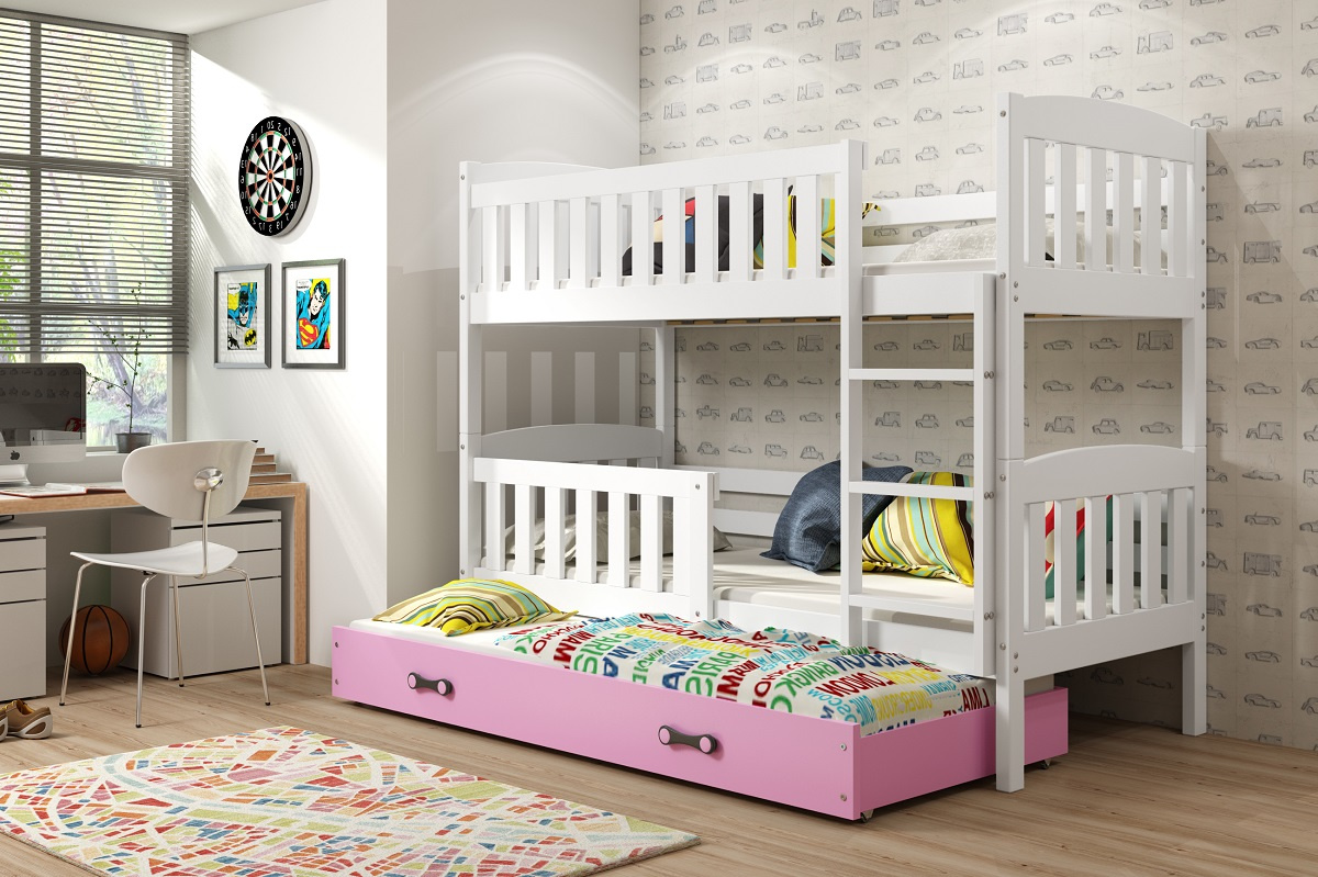 Dětská patrová postel Kuba je výbornou volbou všech rodičů, kteří pro své dítě hledají funkčnost, moderní design a kvalitu. Postel je vyrobena z kvalitního borovicového dřeva. Její stabilní konstrukce, zaoblené hrany a zábrana na horní i dolní posteli, zajišťují bezpečnost a pohodlí dítěte. Žebřík si můžete podle potřeby umístit na pravou, nebo levou stranu postele. Když děti patrová postel omrzí, je možno palandu rozložit na dvě samostatné postele. Součástí postele je také praktická přistýlka s matrací, kterou můžete využít pro další dítě, nebo když u Vašich dětí bude chtít přespat kamarád/ka. Všechny části postele mají rošt a pěnovou matraci v ceně. Plocha pro spaní je 90x200 cm (vrchní a spodní část) a 80x190 cm (přistýlka). Postel je dodávána v demontu a součástí je montážní plánek včetně všech potřebných spojovacích materiálů. Vyobrazené doplňky a dekorace nejsou v ceně.Z obrazení barev na fotografii se může od skutečnosti nepatrně lišit.