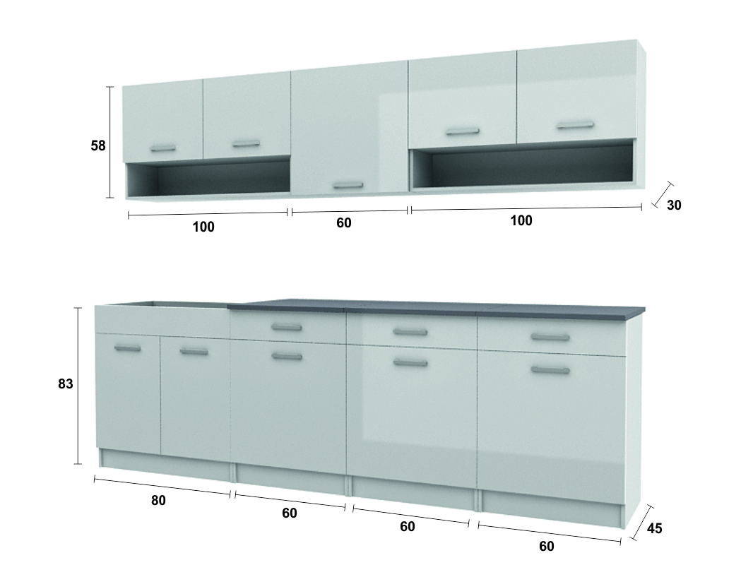 Kuchyňská linka Devil je vyrobena v moderním nadčasovém designu, který se hodí do každého interiéru. Ať už to bude v paneláku, nebo rodinném domě, určitě se bude ve Vaší kuchyni krásně vyjímat. Skříňky nabízejí dostatek úložného prostoru na nádobí i dostatek pracovního prostoru. Kuchyň je vyrobená z lamina, které je odolné a snadné na údržbu. Korpusy skříněk jsou bílé, dvířka jsou ve vysokém lesku v trendy barvách. Skříňky jsou samostatné, takže si kuchyň můžete sestavit buď tak, jak je vyobrazeno na fotografii, nebo si je můžete sestavit podle toho, jak Vám to bude vyhovovat. Kuchyň je dodávána v demontu. Součástí je montážní plánek včetně všech potřebných spojovacích materiálů. Cena je uvedna za sestavu vyobrazenou na úvodní fotografii BEZ PRACOVNÍ DESKY. Spotřebiče,baterie a dekorace nejsou v ceně.